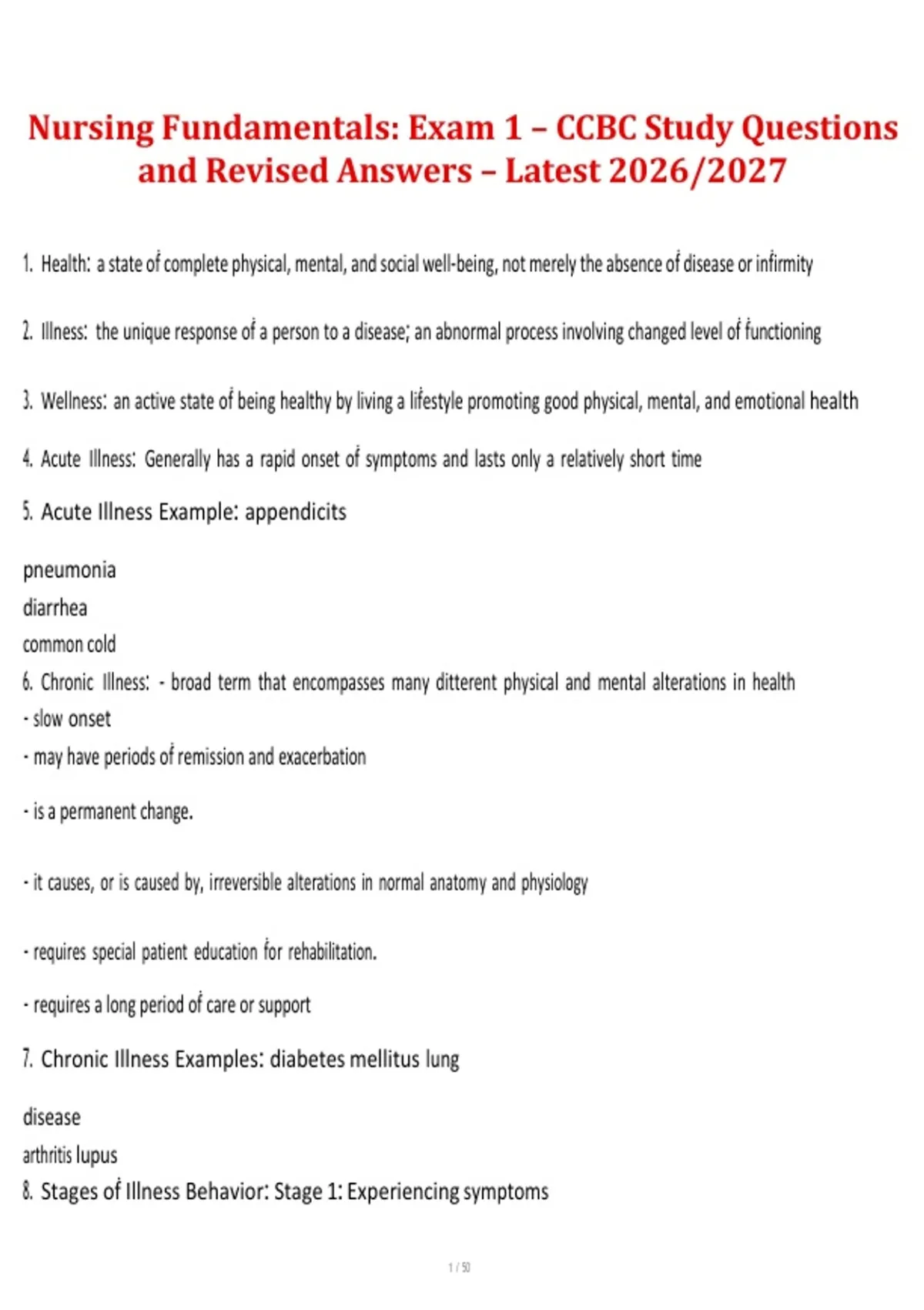 This study guide includes updated study questions and revised answers for Nursing Fundamentals Exam #1 at CCBC. It covers essential foundational nursing topics, core concepts, and exam-focused material to support effective review. The content reflects the latest curriculum and is aligned with the 2026/2027 academic year.