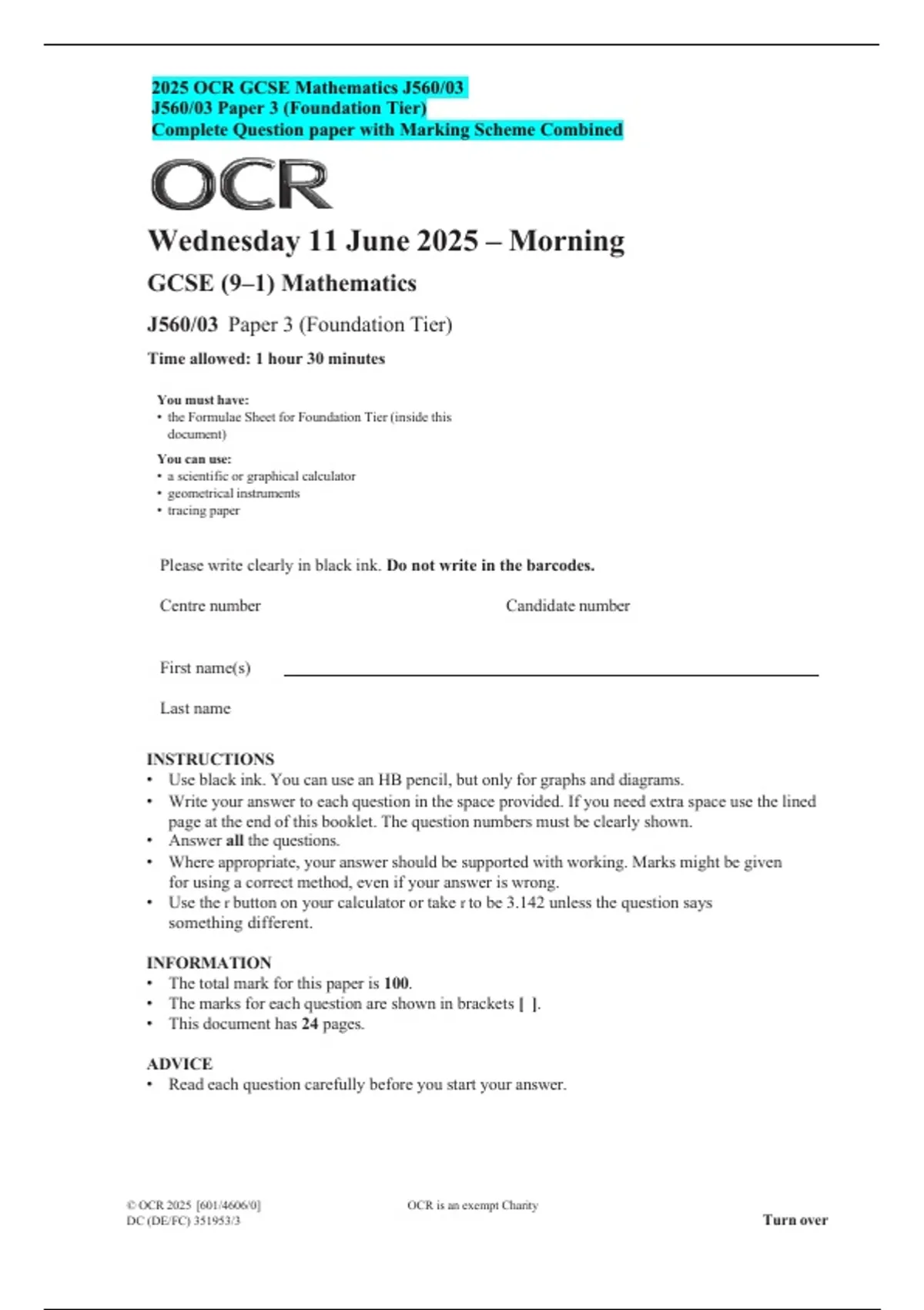 2025 OCR GCSE Mathematics J560/03