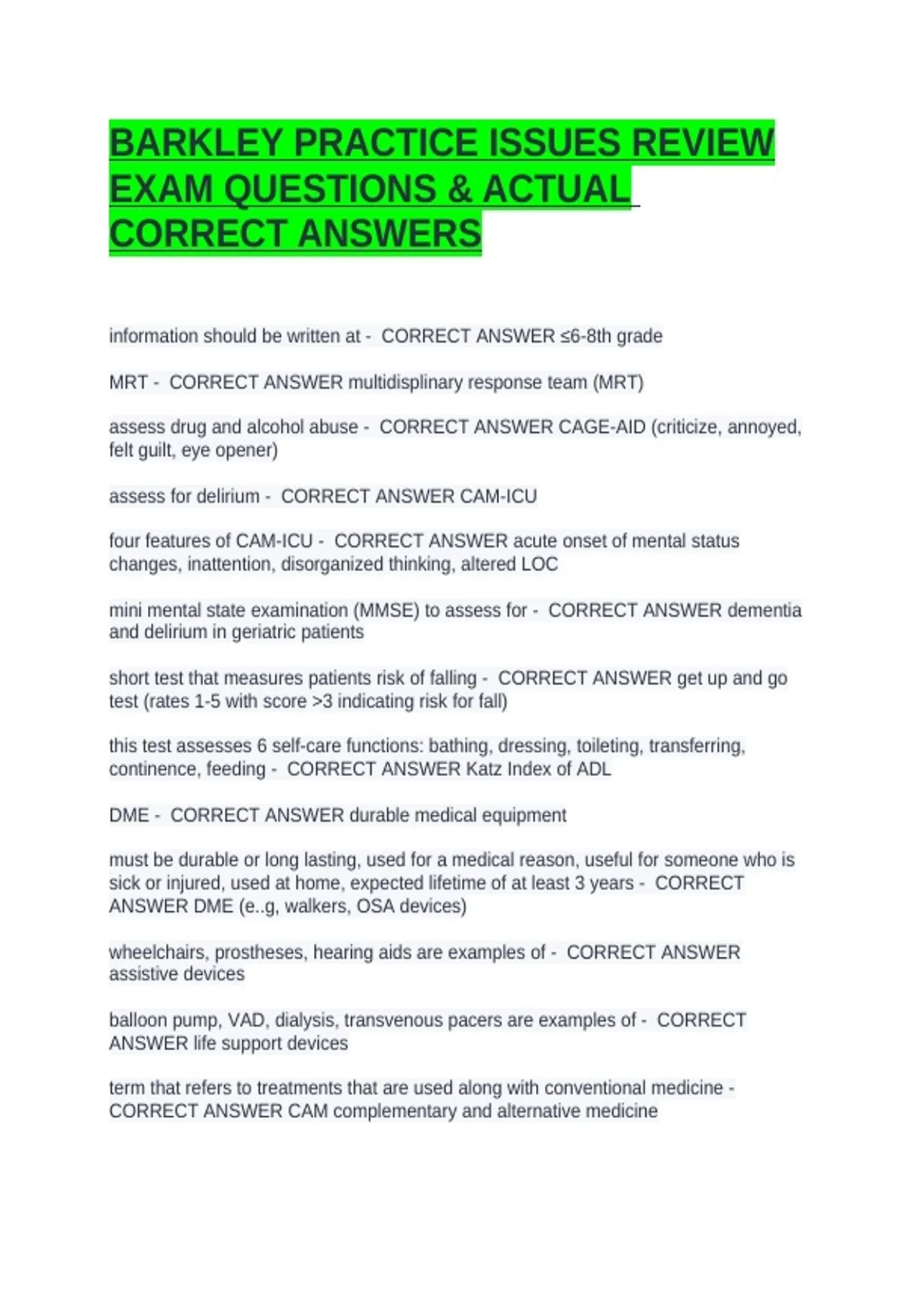 BARKLEY PRACTICE ISSUES REVIEW EXAM QUESTIONS & ACTUAL CORRECT ANSWERS is a nationally recognized NCLEX® preparation program designed to help nursing students and graduates pass the NCLEX-RN® or NCLEX-PN® exam on the first attempt. It is known for its clear, structured teaching style and strong focus on test-taking strategies and clinical reasoning.