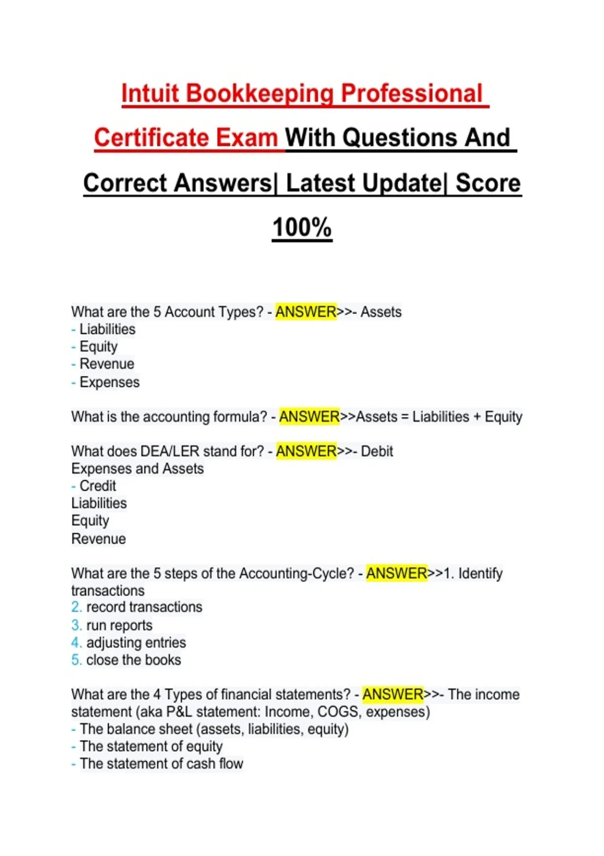 This document covers the full scope of the Intuit Bookkeeping Professional Certificate exam, including accounting fundamentals, the accounting cycle, financial statements, accruals, adjustments, payroll, depreciation, reconciliation, and bookkeeping ethics. It contains extensive practice questions with correct, detailed answers, making it suitable as both a comprehensive study guide and exam preparation material for the latest exam version.