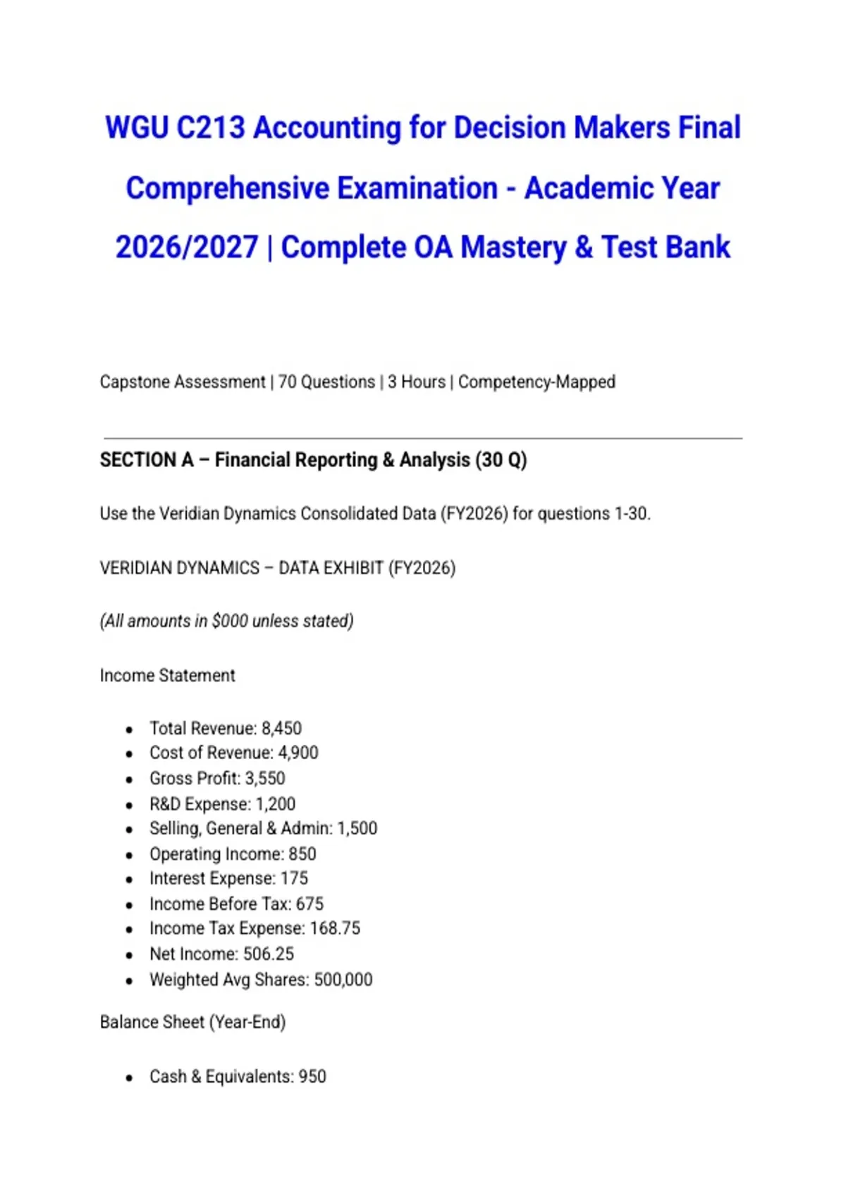 Prepare for your WGU C213 Accounting for Decision Makers Final Comprehensive Examination with this complete OA mastery guide and test bank for Academic Year 2026/2027. This essential resource integrates all course competencies including financial statement interpretation, cost analysis, budgeting strategies, performance measurement, and strategic decision-making frameworks. Comprehensive preparation for demonstrating mastery in Western Governors University's final accounting assessment.