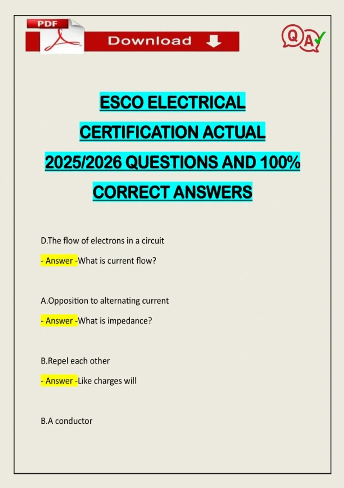 ESCO ELECTRICAL CERTIFICATION ACTUAL 2025/2026 QUESTIONS AND 100% CORRECT ANSWERS D.The flow of electrons in a circuit - Answer -What is current flow? A.Opposition to alternating current - Answer -What is impedance? B.Repel each other - Answer -Like charges will B.A conductorNeed assistance on Online classes, Exams & Assignments? Reach out for instant help!! Full Course Assistance, Plagiarism-free Essay Writing, Research Paper, Dissertation, Discussion Posts, etc…. Confidential & Secure services. Tutors are available for all subjects! Email now at: - Answer -Any material that will readily release electrons is called: B. I - Answer -The symbol for current is: D. All the above light heat magnetism