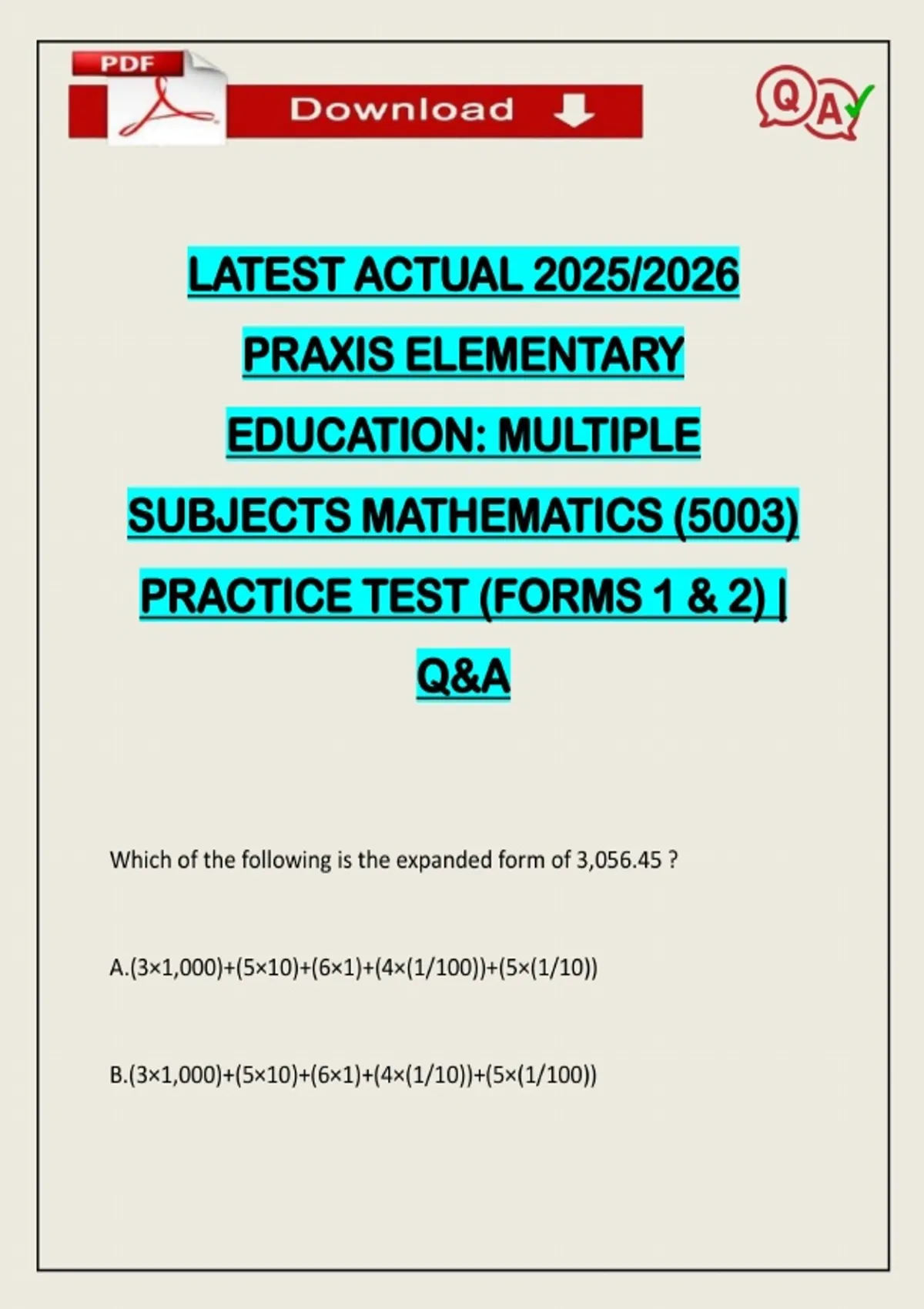 LATEST ACTUAL 2026 PRAXIS ELEMENTARY EDUCATION: MULTIPLE SUBJECTS MATHEMATICS (5003) PRACTICE TEST (FORMS 1 & 2) | Q&A