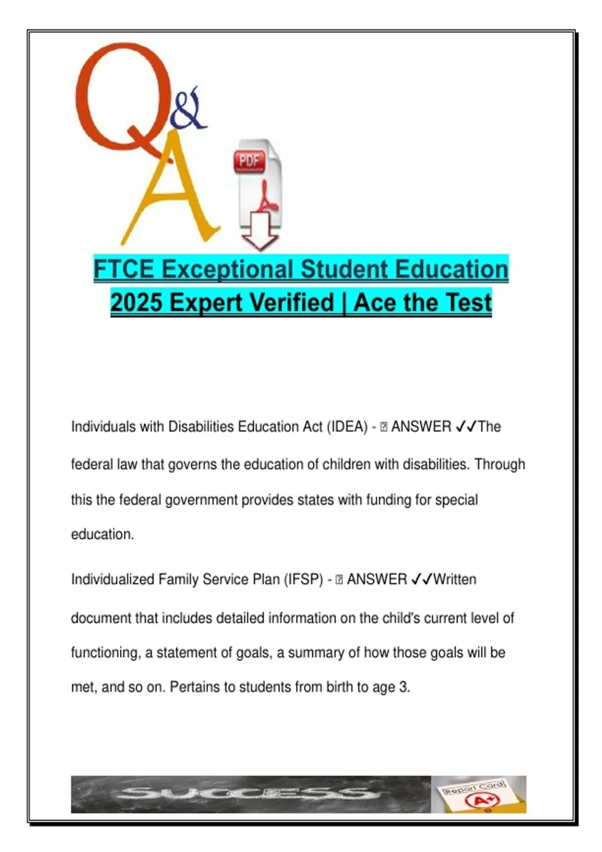 This document includes 100 expert-verified practice questions and answers aligned with the FTCE Exceptional Student Education (ESE) K–12 (Course Code: 801) exam requirements for the 2025 certification cycle. The content provides a deep dive into both foundational principles and practical applications within exceptional student education, making it an essential study resource for exam candidates. Key content areas include: Federal legislation: Covers essential laws such as IDEA, No Child Left Behind (NCLB), and legal procedures like due process, mediation, and manifestation determination review Language development and disorders: Explains components of language including phonology, semantics, syntax, morphology, pragmatics, and related impairments such as apraxia, dysarthria, and expressive language disorders Reading instruction: Focus on phonics instruction, alphabetic principles, decoding phases, contextual and structural analysis, and reciprocal teaching Assessment types: Definitions and uses of norm-referenced, criterion-referenced, diagnostic, screening, performance-based, authentic, and ecological assessments Behavior management: Includes techniques such as Positive Behavior Supports (PBS), Functional Behavior Assessment (FBA), reinforcement types, and behavior intervention planning Instructional methods: Covers systematic instruction, scaffolding, grouping strategies, and explicit vs. implicit phonics instruction Each question is paired with the correct answer and written in concise, exam-focused language, making the resource ideal for independent study, review sessions, and pre-exam practice. Suitable for: Students pursuing degrees in Special Education, Elementary Education, Educational Psychology, or Teacher Preparation programs Candidates preparing for the FTCE ESE K–12 certification exam in Florida Current educators aiming for recertification or career transition into special education Individuals enrolled in alternative certification programs Keywords: FTCE ESE, ESE K–12, Florida teacher certification, IDEA, IEP, FBA, PBS, phonological awareness, language disorders, reading instruction, phonics, morphology, assessments, norm-referenced, authentic assessment, RTI, reinforcement, due process, scaffolding, behavior intervention