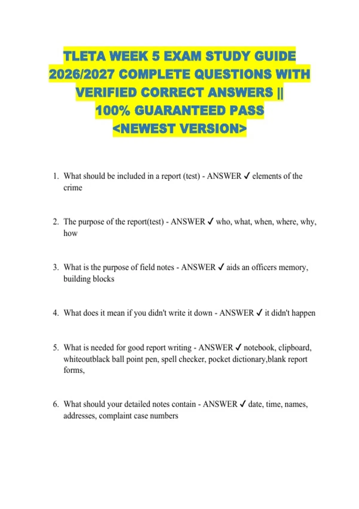 TLETA WEEK 5 EXAM STUDY GUIDE 2026/2027 COMPLETE QUESTIONS WITH VERIFIED CORRECT ANSWERS || 100% GUARANTEED PASS &lt;NEWEST VERSION&gt; 1. What should be included in a report (test) - ANSWER elements of the crime 2. The purpose of the report(test) - ANSWER who, what, when, where, why, how 3. What is the purpose of field notes - ANSWER aids an officers memory, building blocks 4. What does it mean if you didn't write it down - ANSWER it didn't happen 5. What is needed for good report writing - ANSWER notebook, clipboard, whiteoutblack ball point pen, spell checker, pocket dictionary,blank report forms, 6. What should your detailed notes contain - ANSWER date, time, names, addresses, complaint case numbers 7. Gang members have to meet two or more criteria - ANSWER admits to criminal gang activity, identified as a gang member, resides in a common gang area, tattoos, hand signs, certain style of dress, associates with criminal gang members. , identified by informants. 8. When did gangs start in history(test) - ANSWER 19th century, since the beginning of civilization 9. David barksdale - ANSWER Founder of folk nation 10. Two nations used by gangs - ANSWER Folk nation, people nation 11. Number 6 - ANSWER 6 point star 12. Jerome shorty freeman - ANSWER Black disciples 13. People nation - ANSWER Uses the 5 point star 14. People nation - ANSWER All is well 15. Folk nation - ANSWER All is one 16. Latin kings - ANSWER Oldest and largest hispanic street gang 17. Three kinds of graffiti - ANSWER Junk, taggers, gang 18. Why do gangs use graffiti - ANSWER To mark there territory, to communicate threats or insults to others. 19. For r' s for graffitti - ANSWER Read it, record it, report it, remove it 20. Gangs are just a law enforcement problem - ANSWER False- they are everyones problem 21. Common myths about gangs - ANSWER Mostly juvenile,gang members only harm themselves or others, females are not allowed to be in a gang, gangs are all turf oriented, 22. Does a victim of sexual harassment have to be the person being directly harassed? - ANSWER no, it can be anyone who finds the behavior offensive and is affected by it 23. Why are men far less likely to report sexual harassment behavior exhibited toward them? - ANSWER because (1) they don't perceive it as harassment and (2) they're embarrassed to admit it makes them uncomfortable 24. What prohibits discrimination in the workplace on the basis of race, color, religion, sex, or national origin? - ANSWER Title VII of the Civil Rights Act of 1964 25. According to the Title VII of the Civil Rights Act of 1964, what are protected classes in TN? - ANSWER race, color, religion, sex, national origin, creed, pregnancy, disability, age (40 and above) and veteran status 26. When safely positioning a emergency vehicle in an accident, do it in a way that: - ANSWER 1) protected responders from performing duties 2) protect road users traveling 3) minimize disruption of the adjacent traffic flow 27. What are the two types of defensive blocking? - ANSWER Parallel and angled 28. How many lanes should you take when parking in an emergency? - ANSWER As many as it takes to protect the scene 29. What should you consider when positioning vehicles? - ANSWER 1) order of arrival 2) current conditions 3) safety of other responders 4) Visibility 5) agency policy 30. What are the two type of scenes in an accident? - ANSWER Island and split 31. What is conspicuity? - ANSWER Ability of a vehicle to draw attention to its presence 32. True or False? All workers, including emergency workers, shall wear safety vest - ANSWER True