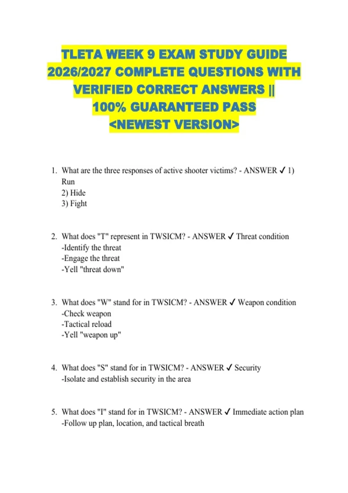 TLETA WEEK 9 EXAM STUDY GUIDE 2026/2027 COMPLETE QUESTIONS WITH VERIFIED CORRECT ANSWERS || 100% GUARANTEED PASS &lt;NEWEST VERSION&gt; 1. What are the three responses of active shooter victims? - ANSWER 1) Run 2) Hide 3) Fight 2. What does "T" represent in TWSICM? - ANSWER Threat condition -Identify the threat -Engage the threat -Yell "threat down" 3. What does "W" stand for in TWSICM? - ANSWER Weapon condition -Check weapon -Tactical reload -Yell "weapon up" 4. What does "S" stand for in TWSICM? - ANSWER Security -Isolate and establish security in the area 5. What does "I" stand for in TWSICM? - ANSWER Immediate action plan -Follow up plan, location, and tactical breath 6. What does "C" stand for in TWSICM? - ANSWER Communicate -Brief dispatch -Yell "blue blue blue" to let other officers know you are an officer 7. What does "M" stand for in TWSICM? - ANSWER Medical -Self assessment swipes to check for blood 8. What is the greatest hazard while conducting building searches? - ANSWER The suspect's ability to hide and wait for you 9. What are the four main areas that are considered "fatal funnels?" - ANSWER 1) Doorways 2) Windows 3) Hallways 4) Stairs (Must negotiate these funnels as quickly as possible) 10. What is the buttonhook technique? - ANSWER When officers are staged on each side of the entry point/doorway 11. How many floors of a building should be searched at a time? - ANSWER One 12. What is the modified buttonhook technique? - ANSWER When officers are staged on the same side of the entry point/doorway 13. Of the 95 counties in Tennessee, how many reported at least one case of human trafficking in ? - ANSWER 78 14. According to "Trafficking Victims Protection Act" (TVPA), what must occur in order for an adult to be considered a victim of human trafficking? - ANSWER Force, fraud, coercion 15. What is the average age of entry for minors into the United States trafficking industry? - ANSWER 13 16. What is the country of origin for the majority of human trafficking victims into the United States? - ANSWER United States 17. A human trafficking victim may not ____ ________ as a victim. Meaning that they may be a victim but do not see themselves as a victim. - ANSWER Self identifify 18. Does the average DWI offender fear arrest? - ANSWER no 19. What is the biggest deterrent for young LEO's from conducting DUI arrests? - ANSWER lack of confidence 20. ______ + ______ = alcohol - ANSWER yeast + sugar 21. What type of alcohol do we consume? - ANSWER ethanol 22. What type of drug is alcohol? - ANSWER a CNS depressant 23. What is the name of the enzyme that aids the metabolism of alcohol? - ANSWER alcohol dehydrogenase enzyme 24. How quickly will the average person's BAC drop per hour? - ANSWER 0.015 25. "The number of grams of alcohol found in 100 milliliters of the person's blood" = ? - ANSWER BAC 26. BAC is the number of _____ of alcohol in every 100 milliliters of blood. - ANSWER grams 27. In which organ of the body does most of the metabolism of the alcohol take place? - ANSWER liver 28. TN's DUI Statute? - ANSWER 55-10-401 29. According to TN's DUI statute, it's illegal for anyone to be in physical control of a motor driven vehicle while doing what 3 things? - ANSWER 1. under the influence of some substance that causes mental and physical impairment; 30. 2. the person's BAC is 0.08 or above; 31. 3. BAC of 0.04 or more and it's a commercial motor vehicle 32. When checking for distinct and sustained nystagmus at maximum deviation, you should move your stimulus at what speed/where? - ANSWER so far to the edge that you cannot see the whites in the corner of the eyes, hold for at least 4 seconds at max deviation