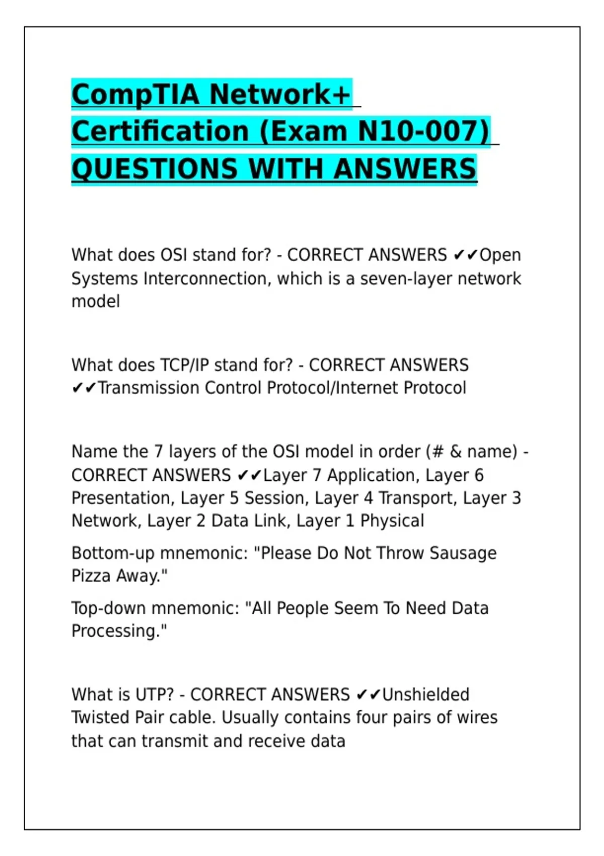 CompTIA Network+ Certification (Exam N10-007) QUESTIONS WITH ANSWERS.