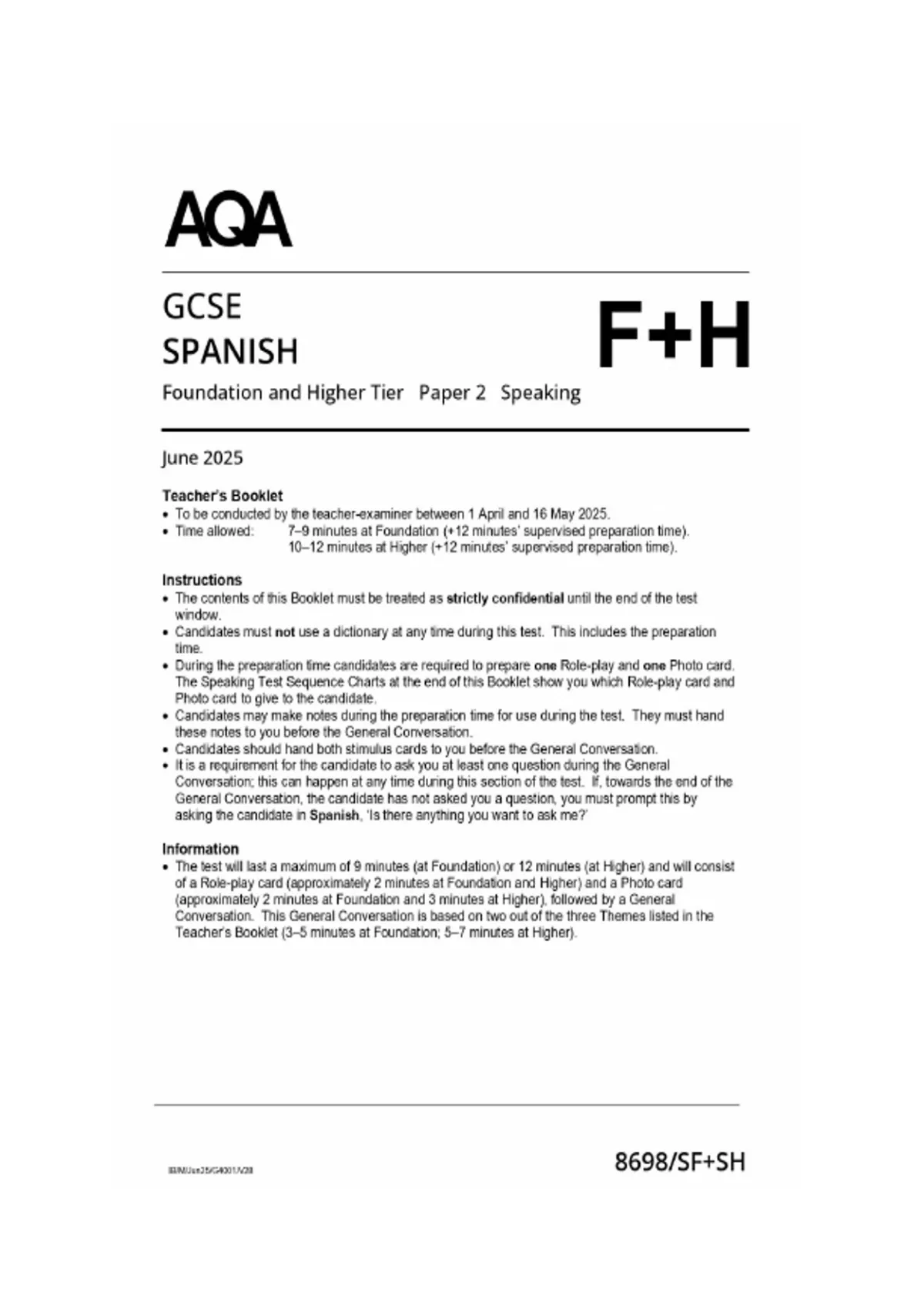 GCSE AQA Spanish Paper 2 Speaking – Foundation & Higher Tier | 2025 Exam merged mark scheme