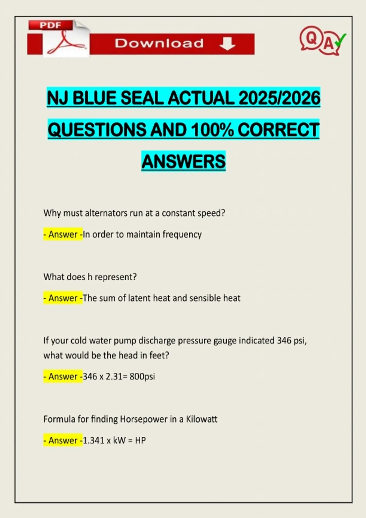 NJ BLUE SEAL ACTUAL 2025/2026 QUESTIONS AND 100% CORRECT ANSWERS Why must alternators run at a constant speed? - Answer -In order to maintain frequency What does h represent? - Answer -The sum of latent heat and sensible heat If your cold water pump di