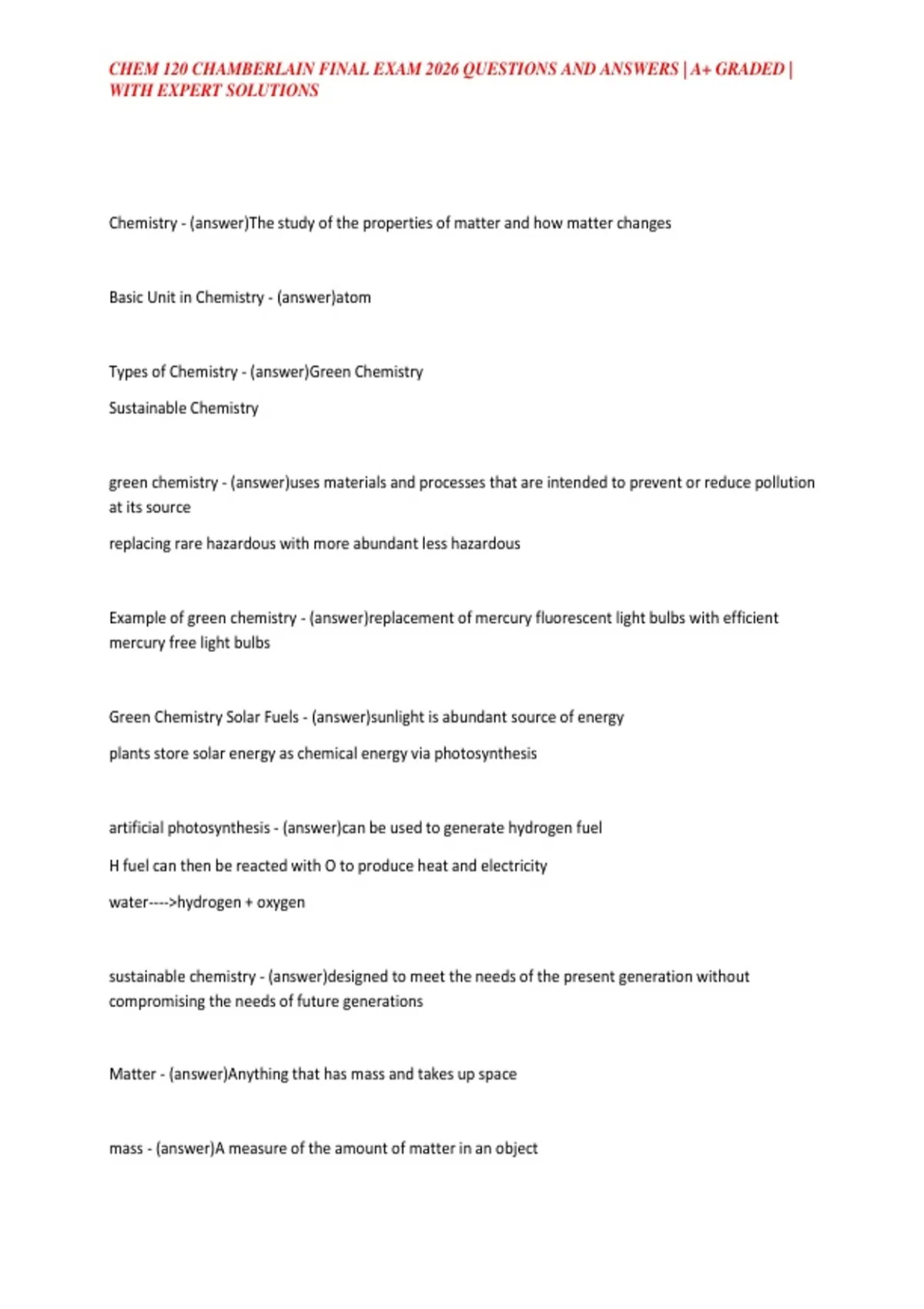 , CHEM 120 CHAMBERLAIN FINAL EXAM 2026 QUESTIONS AND ANSWERS | A+ GRADED |