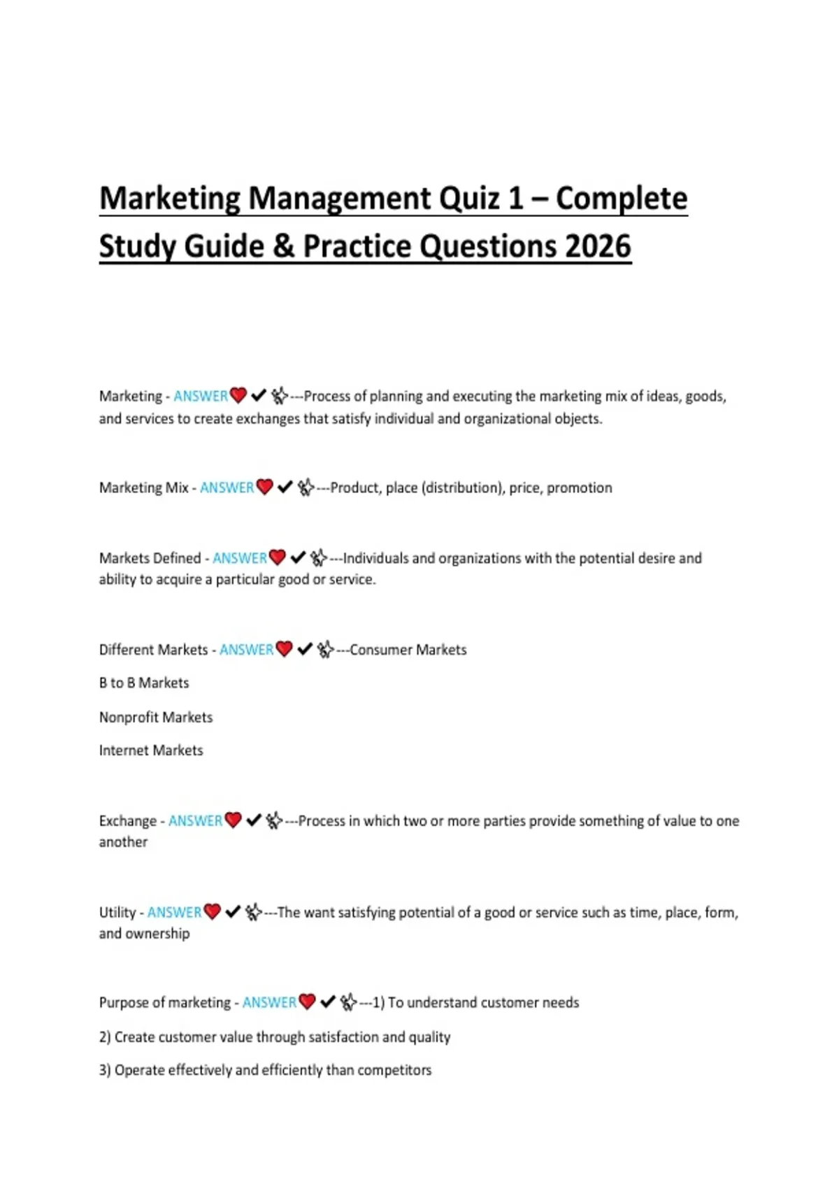 Prepare for Marketing Management Quiz 1 (2026) with this complete study guide. Includes high-yield practice questions, detailed answers, and explanations covering marketing fundamentals, consumer behavior, product development, pricing, promotion, and distribution. Designed to help students master key concepts and excel on quizzes and exams.