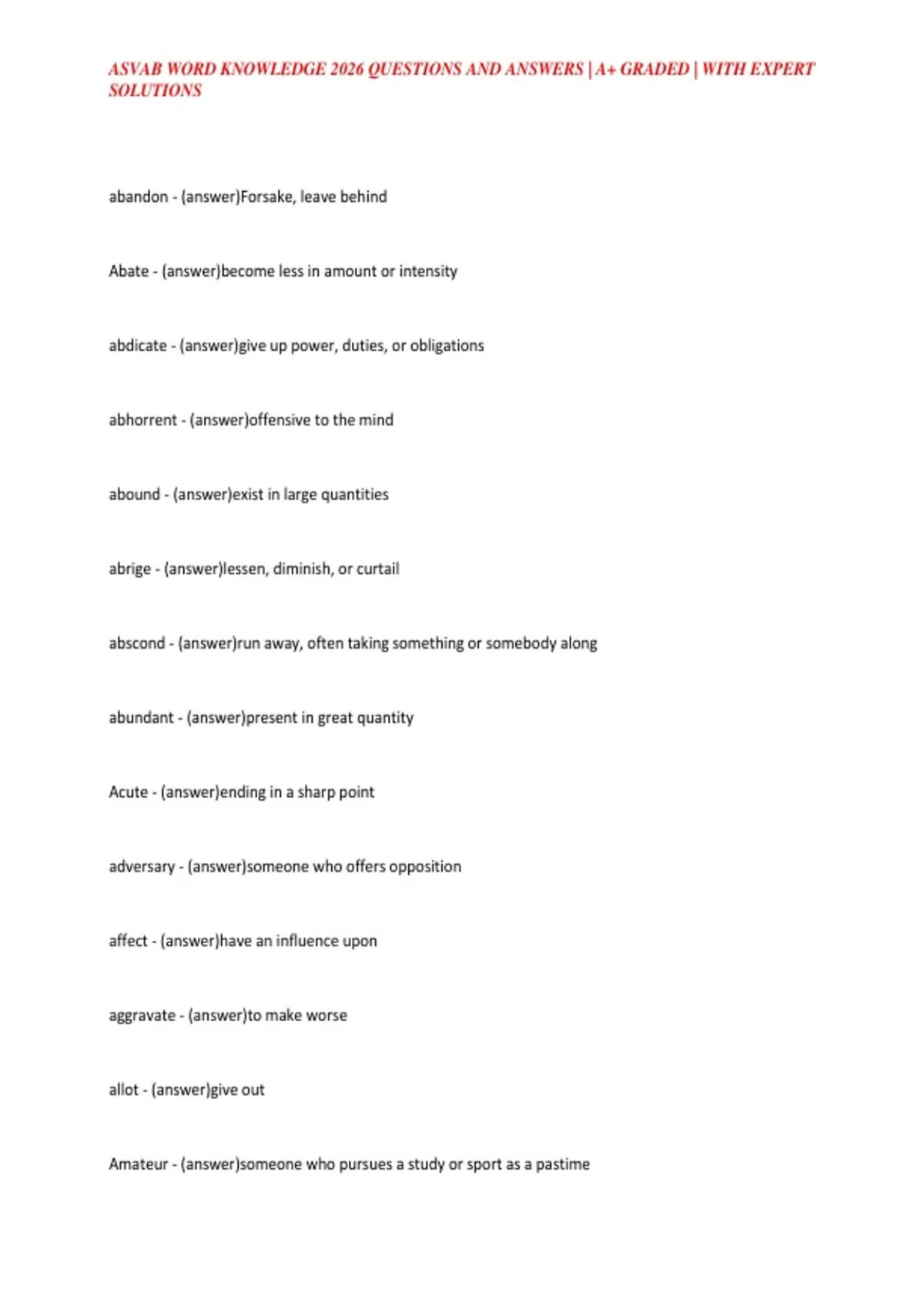 ASVAB WORD KNOWLEDGE 2026 QUESTIONS AND ANSWERS | A+ GRADED | WITH EXPERT SOLUTIONS