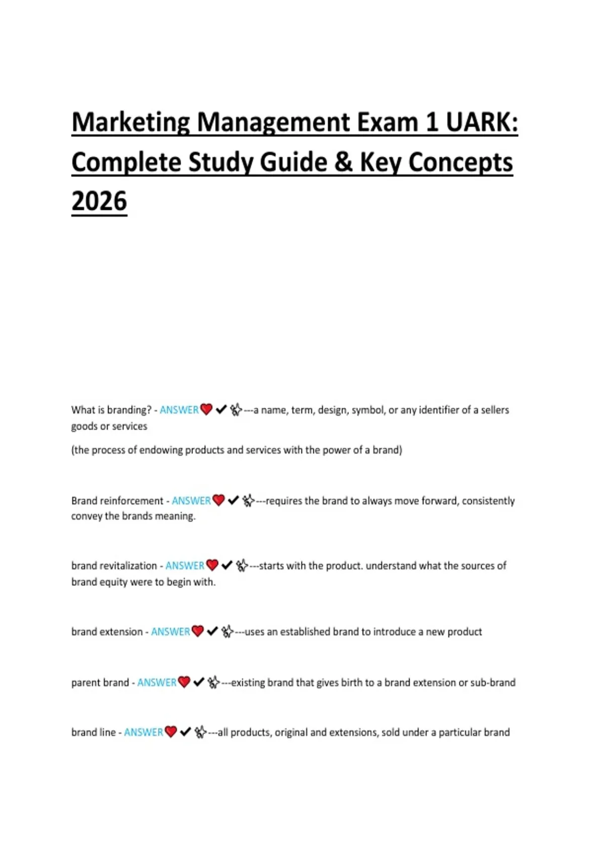 Prepare for Marketing Management Exam 1 at UARK (2026) with this comprehensive study guide. Includes detailed explanations of key concepts, high-yield summaries, practical examples, and exam-focused tips covering marketing fundamentals, consumer behavior, market research, product strategy, pricing, promotion, and distribution to ensure top performance.