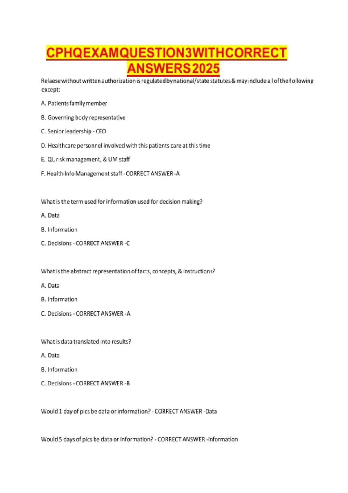 CPHQ EXAM QUESTION 3 WITH CORRECT v v v v v