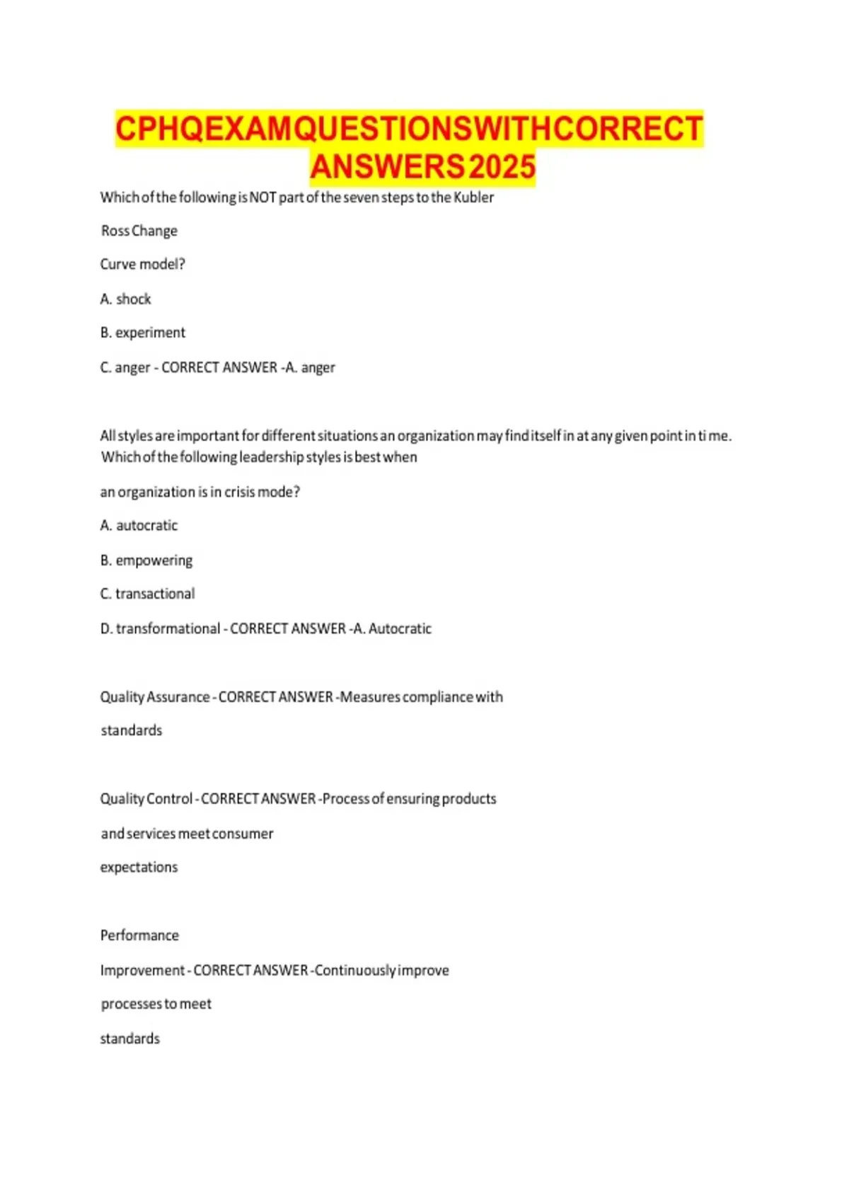 CPHQEXAM QUESTIONSWITH CORRECT v v v v