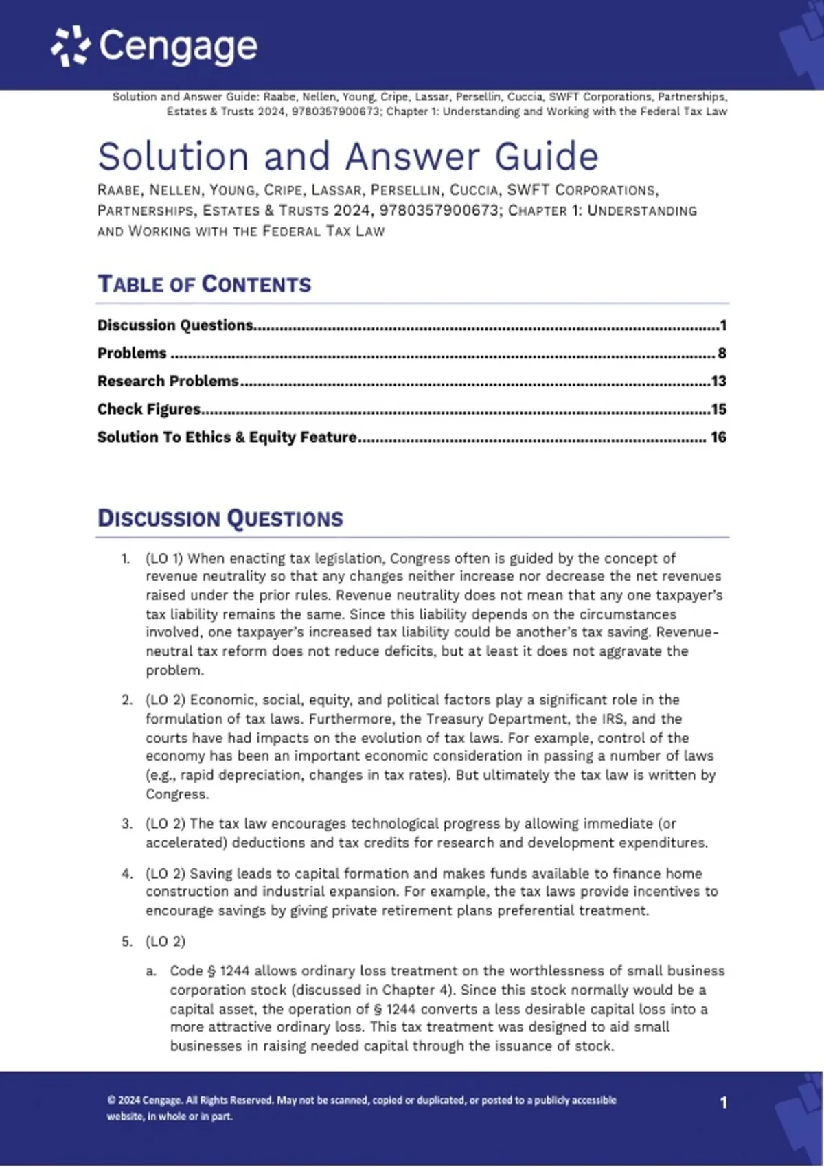 Solution and Answer Guide: Raabe, Nellen, Young, Cripe, Lassar, Persellin, Cuccia, SWFT Corporations, Partnerships,