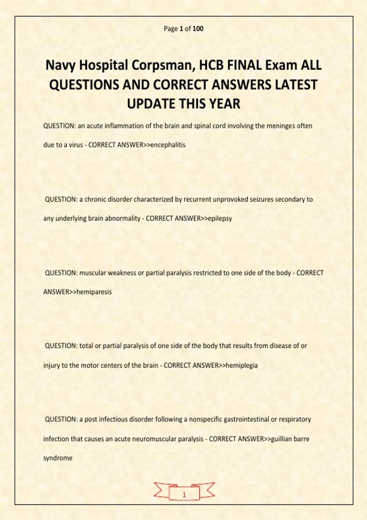Navy Hospital Corpsman, HCB FINAL Exam ALL QUESTIONS AND CORRECT ANSWERS LATEST UPDATE THIS YEAR
