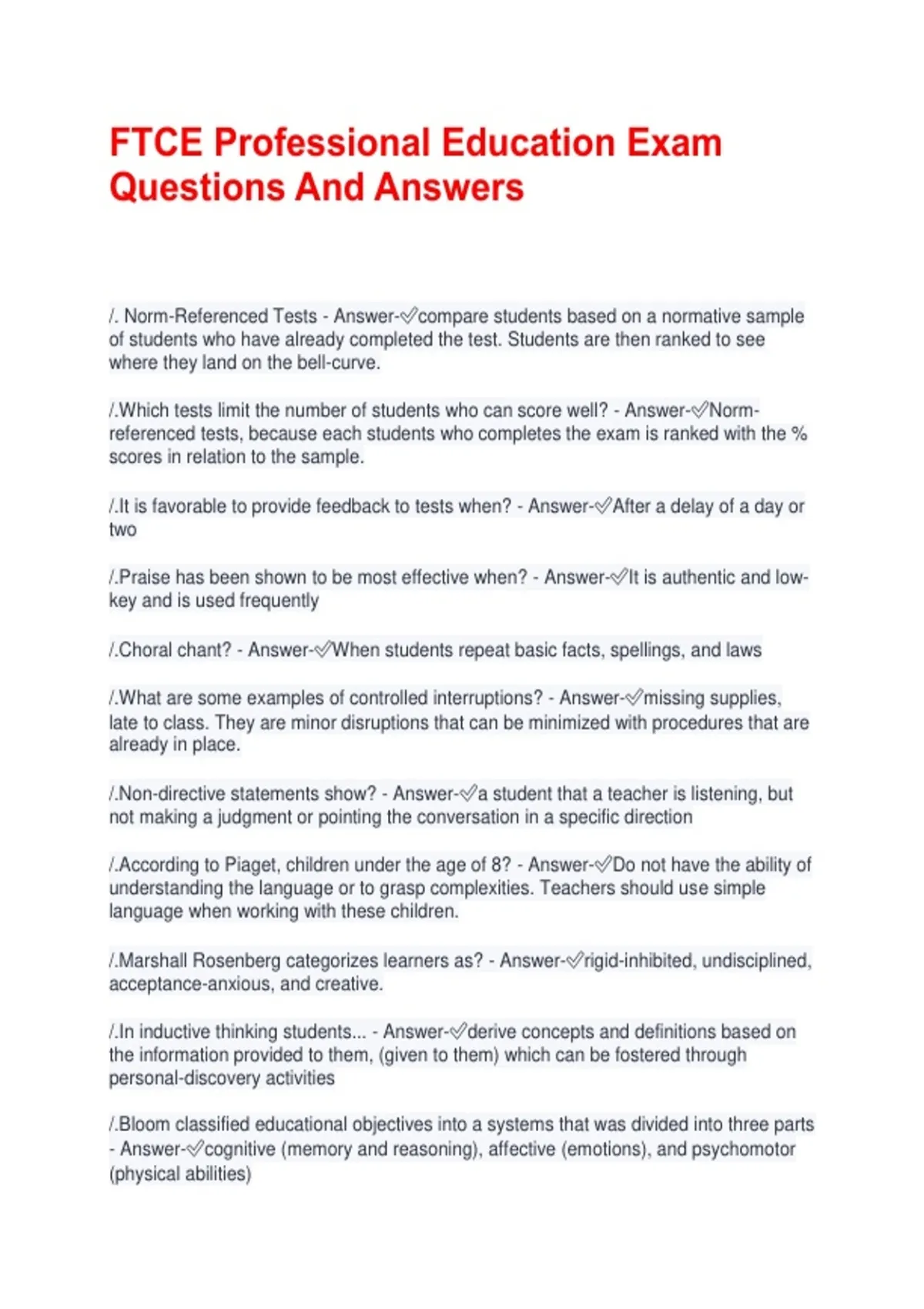 FTCE Professional Education Exam Questions And Answers /. Norm-Referenced Tests - Answer-compare students based on a normative sample of students who have already completed the test. Students are then ranked to see where they land on the bell-curve. /.Which tests limit the number of students who can score well? - Answer-Norm-referenced tests, because each students who completes the exam is ranked with the % scores in relation to the sample. /.It is favorable to provide feedback to tests when? - Answer-After a delay of a day or two /.Praise has been shown to be most effective when? - Answer-It is authentic and low-key and is used frequently /.Choral chant? - Answer-When students repeat basic facts, spellings, and laws /.What are some examples of controlled interruptions? - Answer-missing supplies, late to class. They are minor disruptions that can be minimized with procedures that are already in place. /.Non-directive statements show? - Answer-a student that a teacher is listening, but not making a judgment or pointing the conversation in a specific direction /.According to Piaget, children under the age of 8? - Answer-Do not have the ability of understanding the language or to grasp complexities. Teachers should use simple language when working with these children. /.Marshall Rosenberg categorizes learners as? - Answer-rigid-inhibited, undisciplined, acceptance-anxious, and creative. /.In inductive thinking students... - Answer-derive concepts and definitions based on the information provided to them, (given to them) which can be fostered through personal-discovery activities /.Bloom classified educational objectives into a systems that was divided into three parts - Answer-cognitive (memory and reasoning), affective (emotions), and psychomotor (physical abilities) /.Long term memory is said to be? - Answer-unlimited and permanent. /.Spelling errors do not allow for? - Answer-divergent or creative thinking /.Applying spelling rules or guidelines to improve spelling would be an example of what? - Answer-deductive reasoning /.Sequential language acquisition occurs when? - Answer-A student learns a second language after mastering the first /.The educator has legal obligations to protect a student from - Answer-an abusive home environment, but is not required to report the abuse through the state of Florida code of ethics. /.An example of cognitive learning theory in practice would be? - Answer-using a manipulative to teacher math for students under the age of 11. /.According to the operant model in behavior theory, negative reinforcement is... - Answer-removing a stimulus which causes a behavior to increase. All reinforcement increases the likelihood that the behavior will occur again. /.Students diagnosed with Autism spectrum disorder would not exhibit a delay in... - Answer-physical growth /.Cognitive/Academic Language Proficiency Test - Answer-the aspects of language proficiency strongly related to literacy and academic achievement /.The Natural Approach (ESOL) - Answer-students acquire a new vocabulary through experiences and associations with words because the words are used in meaningful ways and contexts. /.Willig and Lee Four Stages of Development (ESOL) - Answer-pre-production, early production, speech emergence, intermediate fluency /.Cognitive Academic Language Learning Approach (CALLA) - Answer-assists the students in the transition from a language arts program in which the content is made comprehensible through the use of ESOL strategies /.Scaffolding (ESOL) - Answer-students should be provided with steps of learning that allow for consolidation and success.