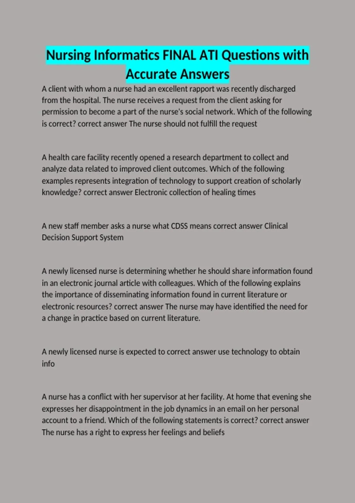 Nursing Informatics FINAL ATI Questions with