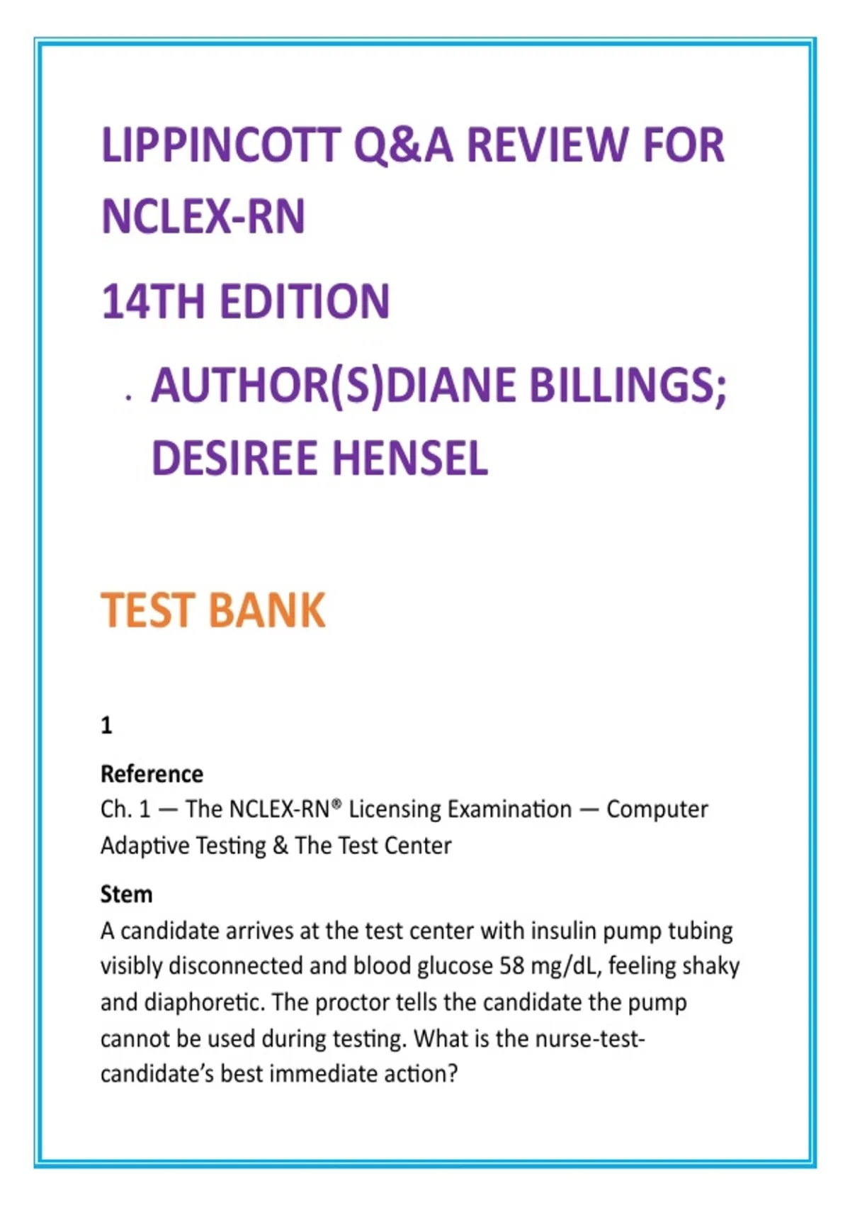 Lippincott Q&A Review for NCLEX-RN Test Bank (14th Ed) | Billings & Hensel | NCLEX-RN Practice Questions 2️⃣ SEO Product Description (200–300 words) Prepare with confidence and pass the NCLEX-RN® on your first attempt using the Lippincott Q&A Review for NCLEX-RN, 14th Edition Test Bank by Diane Billings and Desiree Hensel—a gold-standard resource trusted by nursing educators and students worldwide. This comprehensive digital NCLEX-RN Q&A test bank delivers high-volume, exam-accurate NCLEX-style multiple-choice questions (MCQs) designed to mirror the current NCLEX-RN test plan and clinical judgment expectations. Each question includes clear, concise, evidence-based rationales that reinforce safe practice, prioritization, delegation, and sound nursing decision-making. Built for efficient, high-yield review, this resource helps students identify knowledge gaps, strengthen clinical reasoning, and master exam-level thinking required for RN licensure success. Questions progress beyond memorization to emphasize application, analysis, and prioritization, aligning with modern NCLEX standards and nursing program outcomes. Key Features & Benefits Comprehensive coverage of all NCLEX-RN client needs categories Thousands of NCLEX-style MCQs reflecting real exam difficulty Verified rationales for correct and incorrect answers Strong emphasis on patient safety, delegation, and prioritization Ideal for final-semester nursing students and repeat test-takers Supports ATI, HESI, Kaplan, and comprehensive exit exam preparation Digital format for flexible, time-efficient study Ideal For NCLEX-RN Review Courses Comprehensive Nursing Exit Exams Capstone / Final-Semester Nursing Review RN Licensure Preparation Programs ATI / HESI / Kaplan NCLEX Transition Courses Study smarter, think like the NCLEX, and enter the exam with confidence using this trusted Lippincott NCLEX-RN test bank. 3️⃣ High-Value SEO Keywords (8) Lippincott Q&A Review for NCLEX-RN test bank Billings Hensel NCLEX review NCLEX-RN practice questions nursing licensure exam study guide NCLEX-style MCQs with rationales RN NCLEX test bank PDF NCLEX clinical judgment questions nursing exam preparation test bank 4️⃣ Optimized Hashtags (10) #NCLEXRN #LippincottNCLEX #NCLEXTestBank #NursingLicensure #RNExamPrep #NCLEXPracticeQuestions #NursingStudents #FinalSemesterNursing #NCLEXReview #RNPreparation