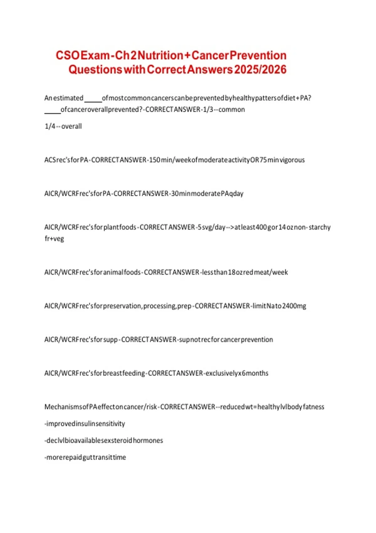 CSO Exam - Ch 2 Nutrition + Cancer Prevention Questions with Correct Answers