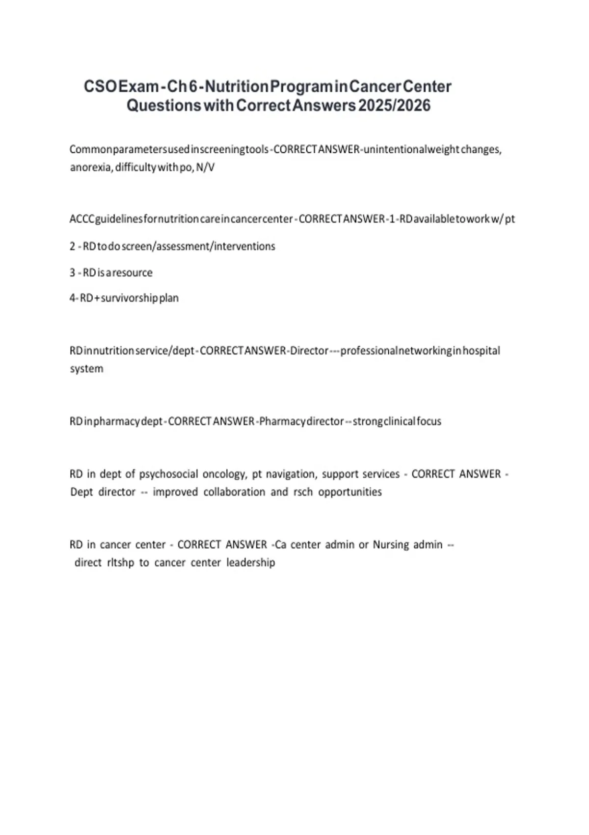 CSO Exam - Ch 6 - Nutrition Program in Cancer Center Questions with Correct Answers