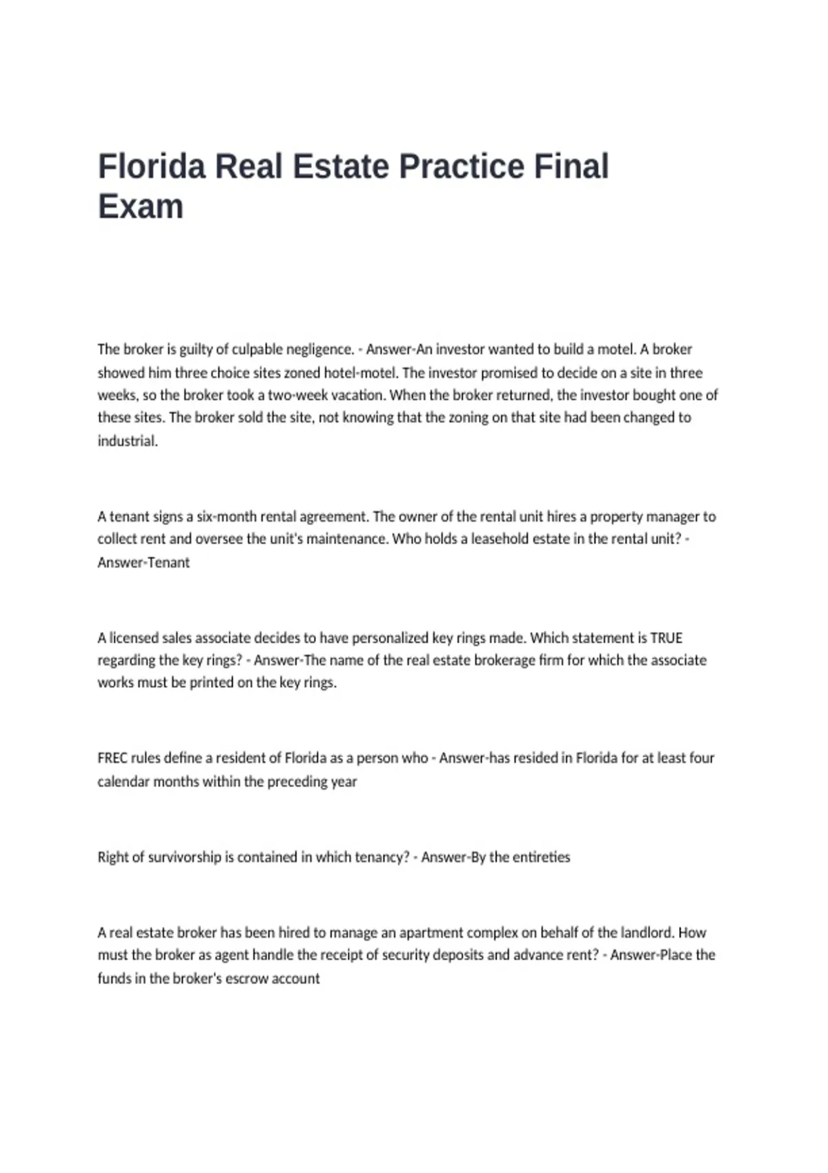 Florida Real Estate Practice Final Exam Questions and Answers