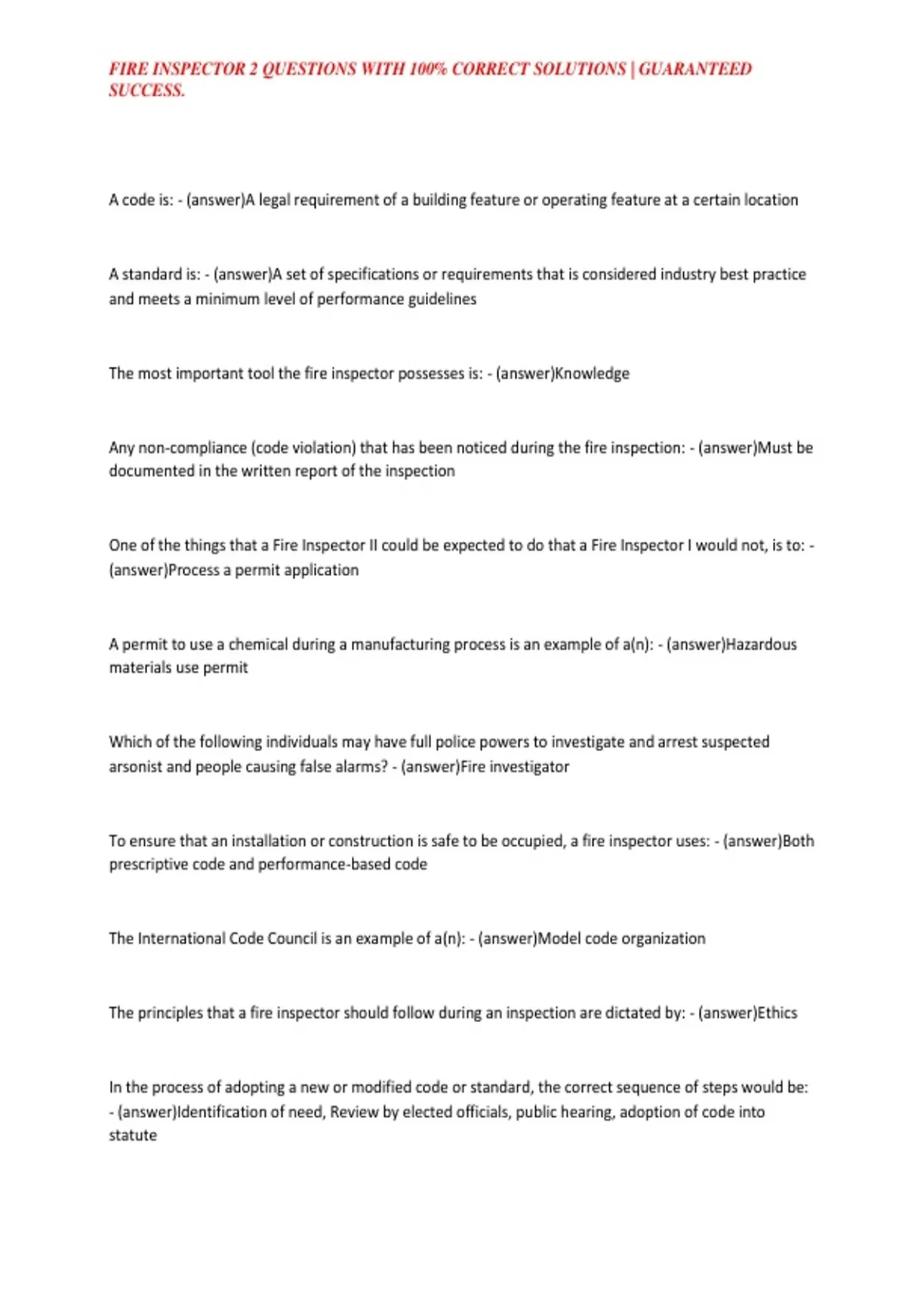 FIRE INSPECTOR 2 QUESTIONS WITH 100% CORRECT SOLUTIONS | GUARANTEED