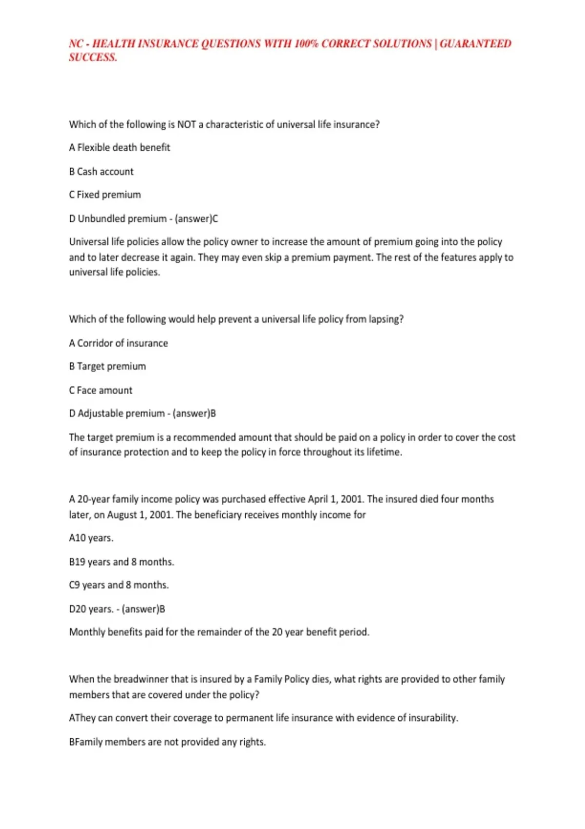 NC - HEALTH INSURANCE QUESTIONS WITH 100% CORRECT SOLUTIONS | GUARANTEED