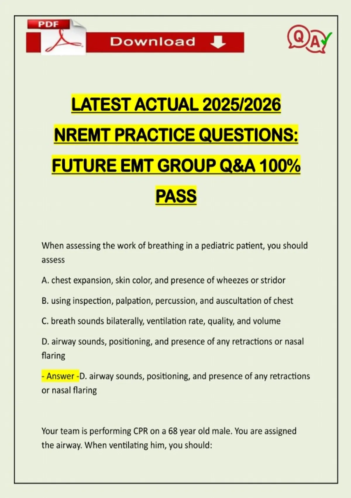 LATEST ACTUAL 2026 NREMT PRACTICE QUESTIONS: FUTURE EMT GROUP Q&A 100% PASS