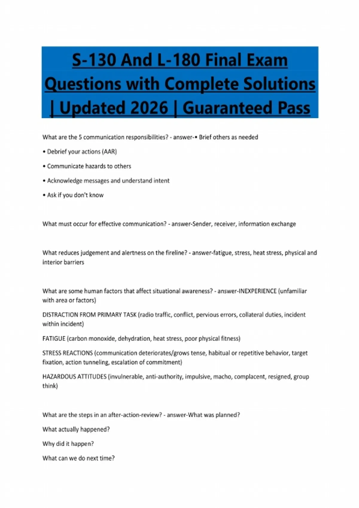 S-130 And L-180 Final Exam Questions with Complete Solutions | Updated 2026 | Guaranteed Pass What are the 5 communication responsibilities? - answer-• Brief others as needed • Debrief your actions (AAR) • Communicate hazards to others • Acknowledge messages and understand intent • Ask if you don't know What must occur for effective communication? - answer-Sender, receiver, information exchange What reduces judgement and alertness on the fireline? - answer-fatigue, stress, heat stress, physical and interior barriers What are some human factors that affect situational awareness? - answer-INEXPERIENCE (unfamiliar with area or factors) DISTRACTION FROM PRIMARY TASK (radio traffic, conflict, pervious errors, collateral duties, incident within incident) FATIGUE (carbon monoxide, dehydration, heat stress, poor physical fitness) STRESS REACTIONS (communication deteriorates/grows tense, habitual or repetitive behavior, target fixation, action tunneling, escalation of commitment) HAZARDOUS ATTITUDES (invulnerable, anti-authority, impulsive, macho, complacent, resigned, group think) What are the steps in an after-action-review? - answer-What was planned? What actually happened? Why did it happen? What can we do next time?When is an AAR most effective? - answer-when performed immediately after event, leader's role is to ensure skilled facilitation, reinforce respectful disagreement is ok, focus on what instead of who, make sure everyone participates, end on a positive note What are the 10 standard firefighting orders? - answer--Keep informed on fire weather conditions and forecasts -Know what your fire is doing at all times -Base all actions on current and expected behavior of the fire -Identify escape routes and safety zones and make them known -Post lookouts when possible danger -Be alert, keep calm, think clearly, act decisively -Maintain prompt communications with your forces, your supervisor, and adjoining forces -Give clear instructions and be sure they are understood -Maintain control of your forces at all times -Fight fire aggressively, having provided for safety first What are the 18 watch-out situations? - answer--Fire not scouted and sized up -In country not seen in daylight -Safety zones and escape routes not identified -Unfamiliar with weather and local factors influencing fire behavior -Uninformed on strategy, tactics, and hazards -Instructions and assignments not clear -No communication link with crew members or supervisor -constructing fireline without safe anchor point -building fireline downhill with fire below -attempting frontal assault on fire -unburned fuel between you and the fire -cannot see main fire and not in contact with someone who can -on hillside where rolling material can ignite fuel below