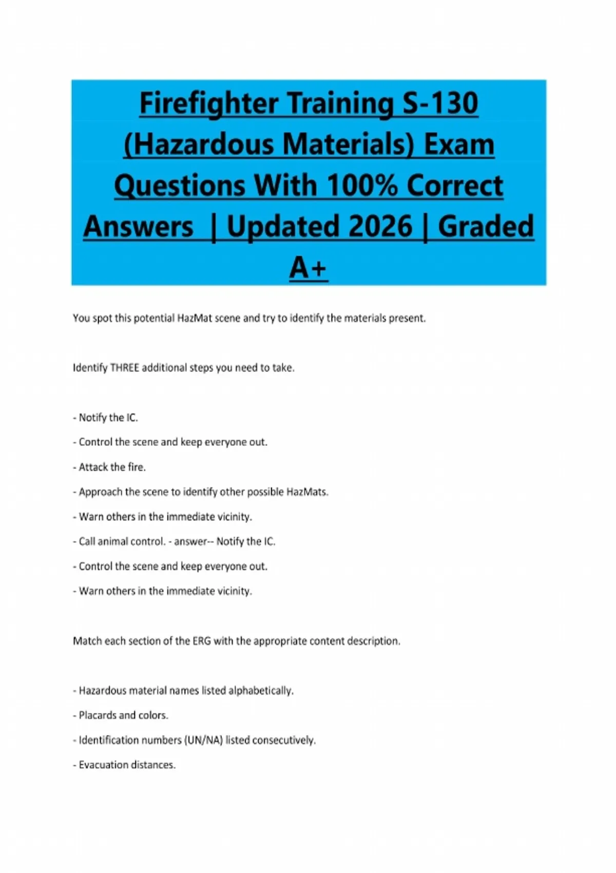 Firefighter Training S-130 (Hazardous Materials) Exam Questions With 100% Correct Answers | Updated 2026 | Graded A+ You spot this potential HazMat scene and try to identify the materials present. Identify THREE additional steps you need to take. - Notify the IC. - Control the scene and keep everyone out. - Attack the fire. - Approach the scene to identify other possible HazMats. - Warn others in the immediate vicinity. - Call animal control. - answer-- Notify the IC. - Control the scene and keep everyone out. - Warn others in the immediate vicinity. Match each section of the ERG with the appropriate content description. - Hazardous material names listed alphabetically. - Placards and colors. - Identification numbers (UN/NA) listed consecutively. - Evacuation distances.- Hazards of an identified material. - answer-- Hazardous material names listed alphabetically. (BLUE SECTION) - Placards and colors. (WHITE PAGES) - Identification numbers (UN/NA) listed consecutively. (YELLOW SECTION) - Evacuation distances. (GREEN SECTION) - Hazards of an identified material. (ORANGE SECTION) Identify THREE terms that are NOT part of the DECIDE process. - Explain - Choose - Detect - Do - Examine - Investigate - answer-- Explain - Examine - Investigate The acronym describing the series of proper decisions to make for reducing a hazardous materials incident's potential harm is: - HAZMAT - GEBMO - DECIDE - OCMPSS - answer-- DECIDEIdentify the most dangerous hazardous material detection clue to rely on. - Container shapes. - Occupancy and location. - Your senses. - Placards and labels. - answer-- Your senses.