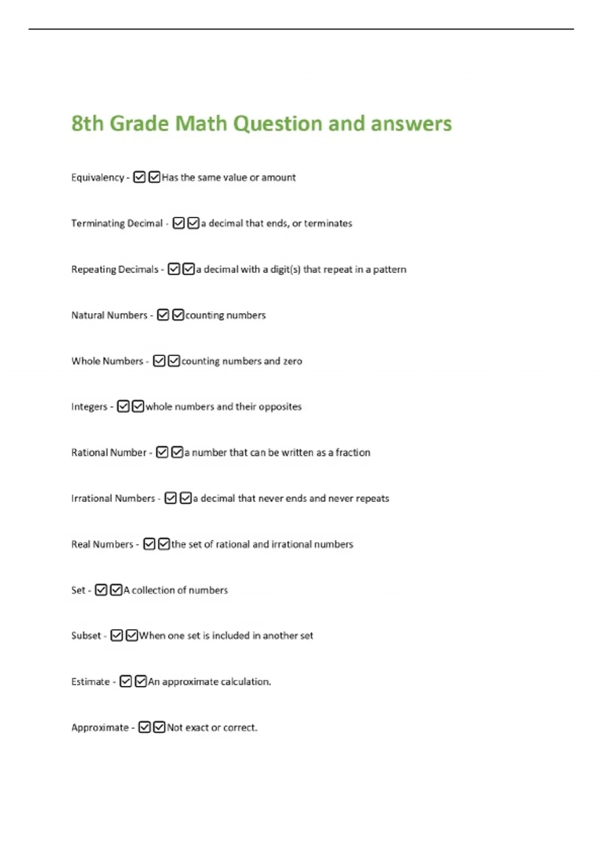 8th Grade Math Question and answers Equivalency - Has the same value or amount Terminating Decimal - a decimal that ends, or terminates Repeating Decimals - a decimal with a digit(s) that repeat in a pattern Natural Numbers - counting numbers Whole Numbers - counting numbers and zero Integers - whole numbers and their opposites