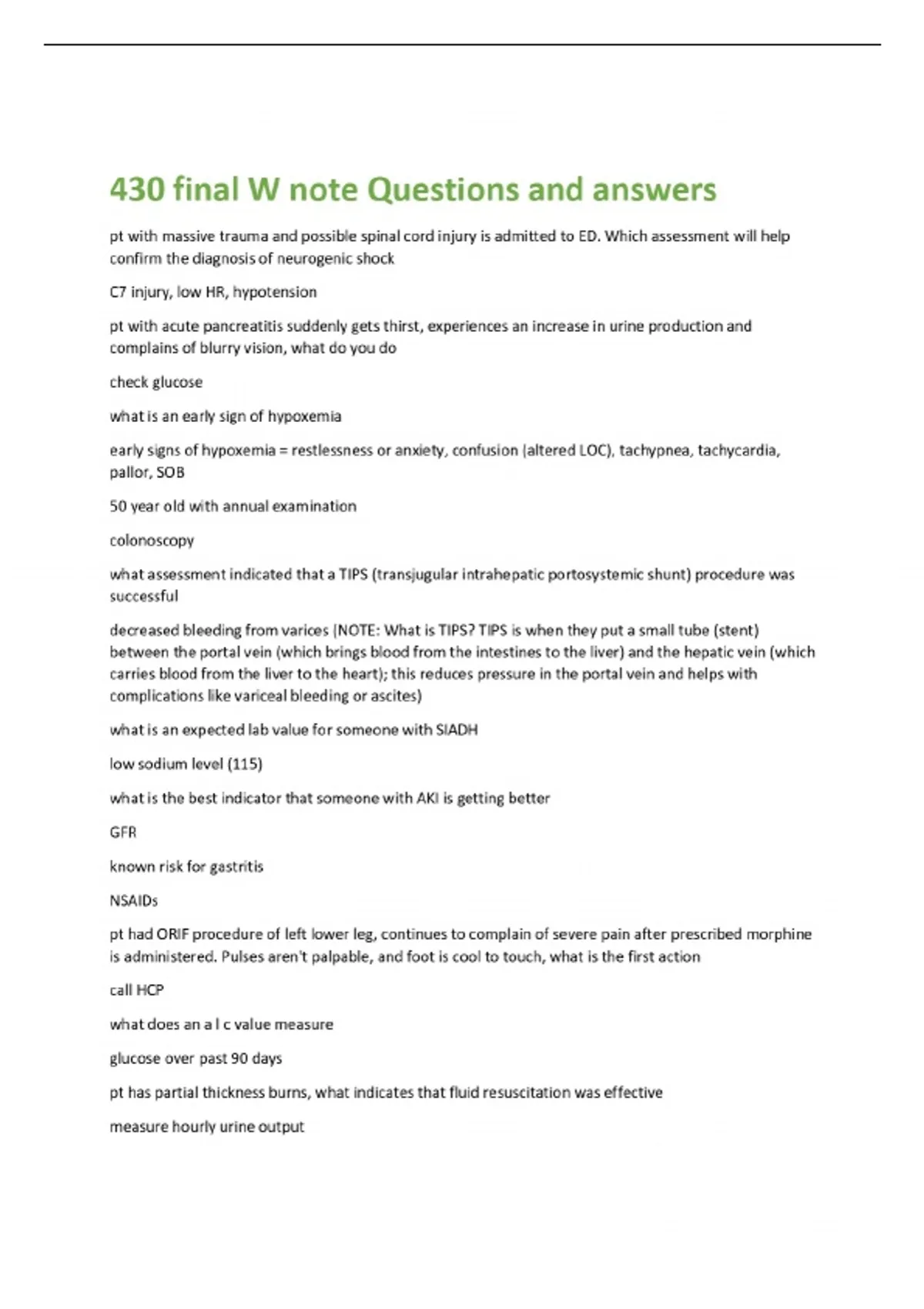 430 final W note Questions and answers pt with massive trauma and possible spinal cord injury is admitted to ED. Which assessment will help confirm the diagnosis of neurogenic shock C7 injury, low HR, hypotension pt with acute pancreatitis suddenly gets thirst, experiences an increase in urine production and complains of blurry vision, what do you do check glucose what is an early sign of hypoxemia early signs of hypoxemia = restlessness or anxiety, confusion (altered LOC), tachypnea, tachycardia, pallor, SOB 50 year old with annual examination