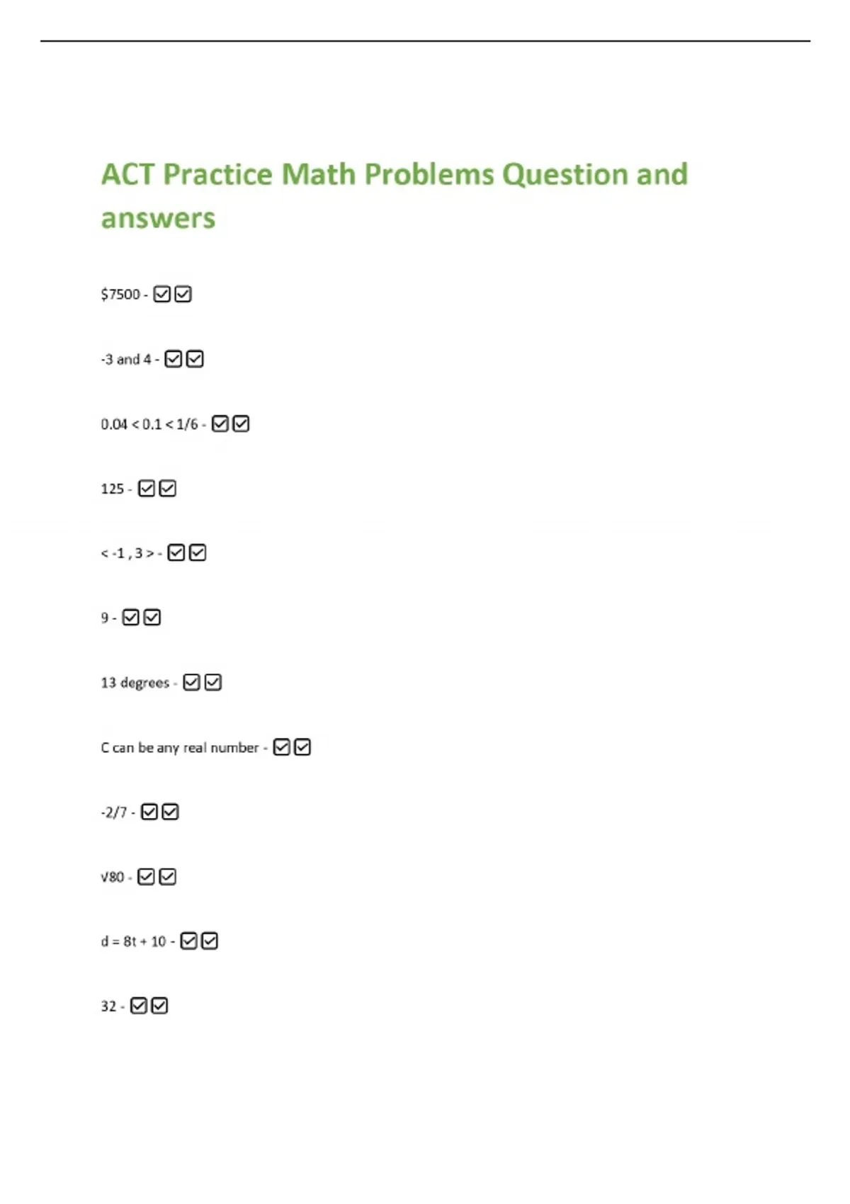 ACT Practice Math Problems Question and answers $7500 - -3 and 4 - 0.04 < 0.1 < 1/6 - 125 - < -1 , 3 > -