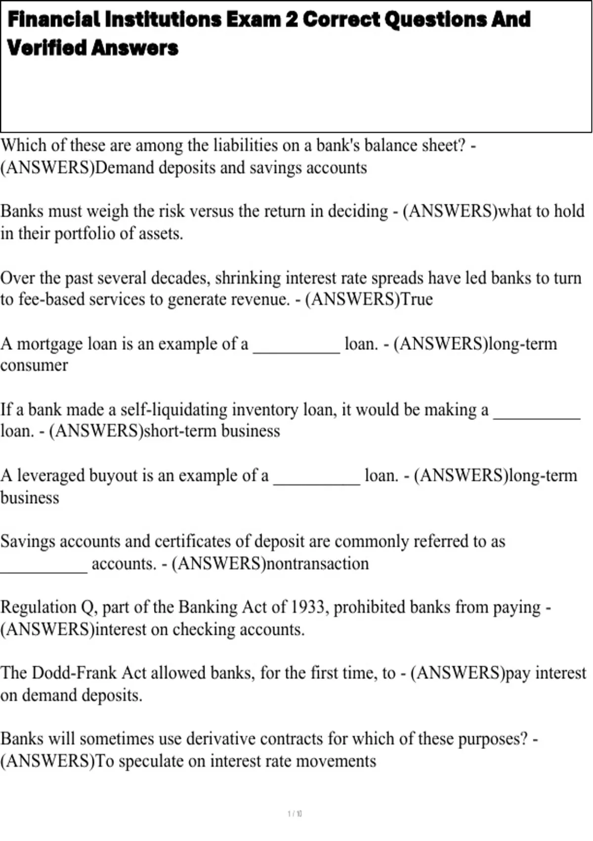 Financial Institutions Exam 2 Correct Questions And Verified Answers