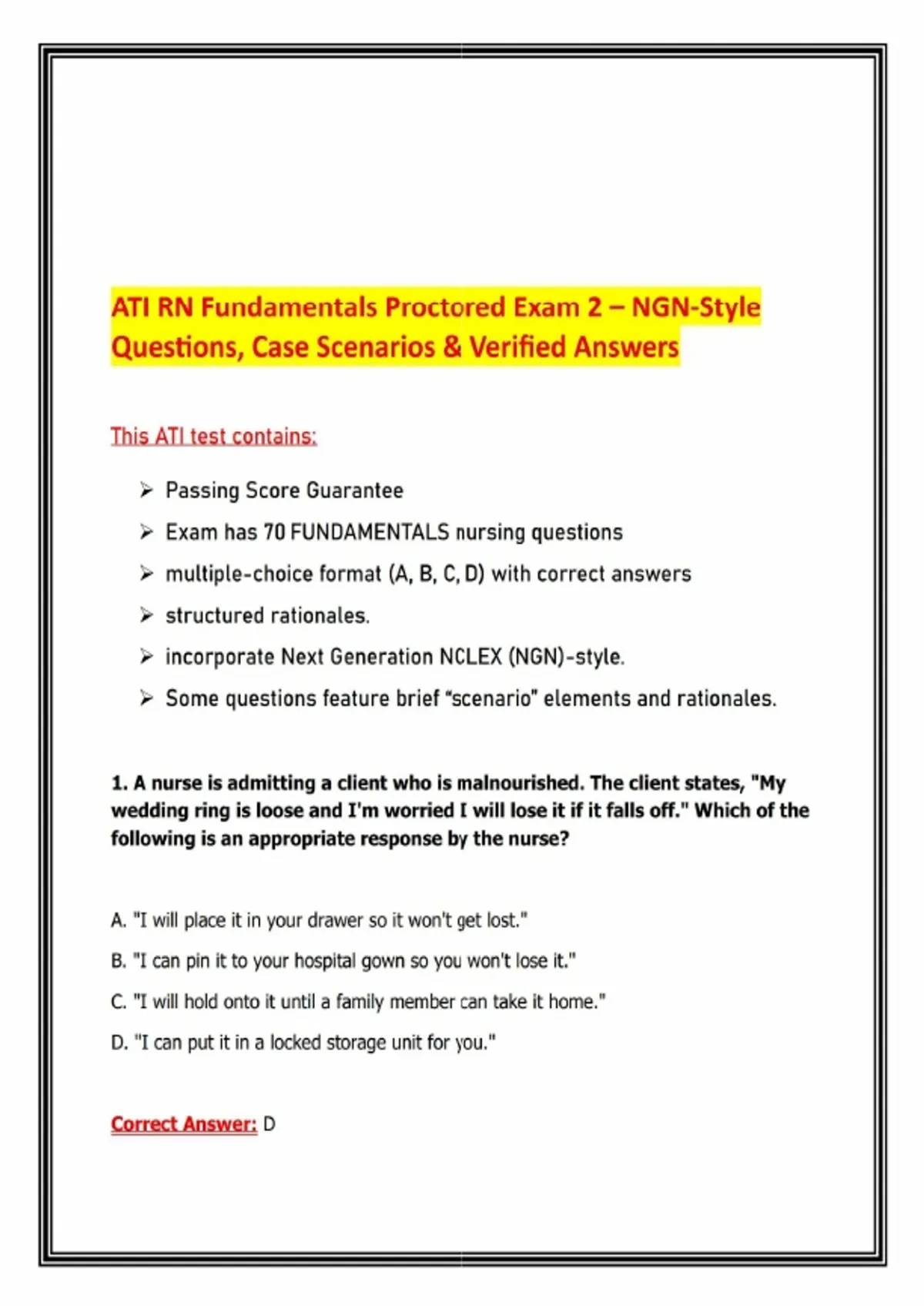 ATI RN Fundamentals Proctored Exam 2 – NGN Style Questions, Case Scenarios & Verified AnswersThis ATI RN Fundamentals Proctored Exam 2 Study Resource contains actual exam‑style questions and answers designed to help nursing students prepare for ATI proctored exams and NCLEX. It incorporates Next Generation NCLEX (NGN) case scenarios with structured rationales to ensure deep understanding and exam success. What’s Inside: - 70 Fundamentals Nursing Questions in multiple‑choice format (A, B, C, D) - Verified Correct Answers with concise rationales - NGN‑Style Case Scenarios to mirror the latest ATI and NCLEX exam formats - High‑yield topics covered: - Client safety & valuables management (locked storage for belongings) - Ethical dilemmas (truth telling vs. family requests) - Restraint use guidelines (only when client poses a threat to self/others) - Pediatric dosage calculations (diphenhydramine syrup example) - Delirium vs. dementia (abrupt onset vs. gradual progression) - Grief responses (denial, acceptance, anger, depression) - Breast self‑examination techniques (circular motions under arms) - Safe transfer techniques (bearing weight on stronger leg) - IV medication administration sequence (ondansetron bolus steps) - Insulin mixing rules (Regular before NPH) Key Benefits: - Structured rationales explain why each answer is correct - Incorporates NGN‑style case scenarios for realistic practice - Designed to help students achieve a Level 2 or higher on ATI Fundamentals exams - Perfect for ATI prep, NCLEX review, and nursing school succes