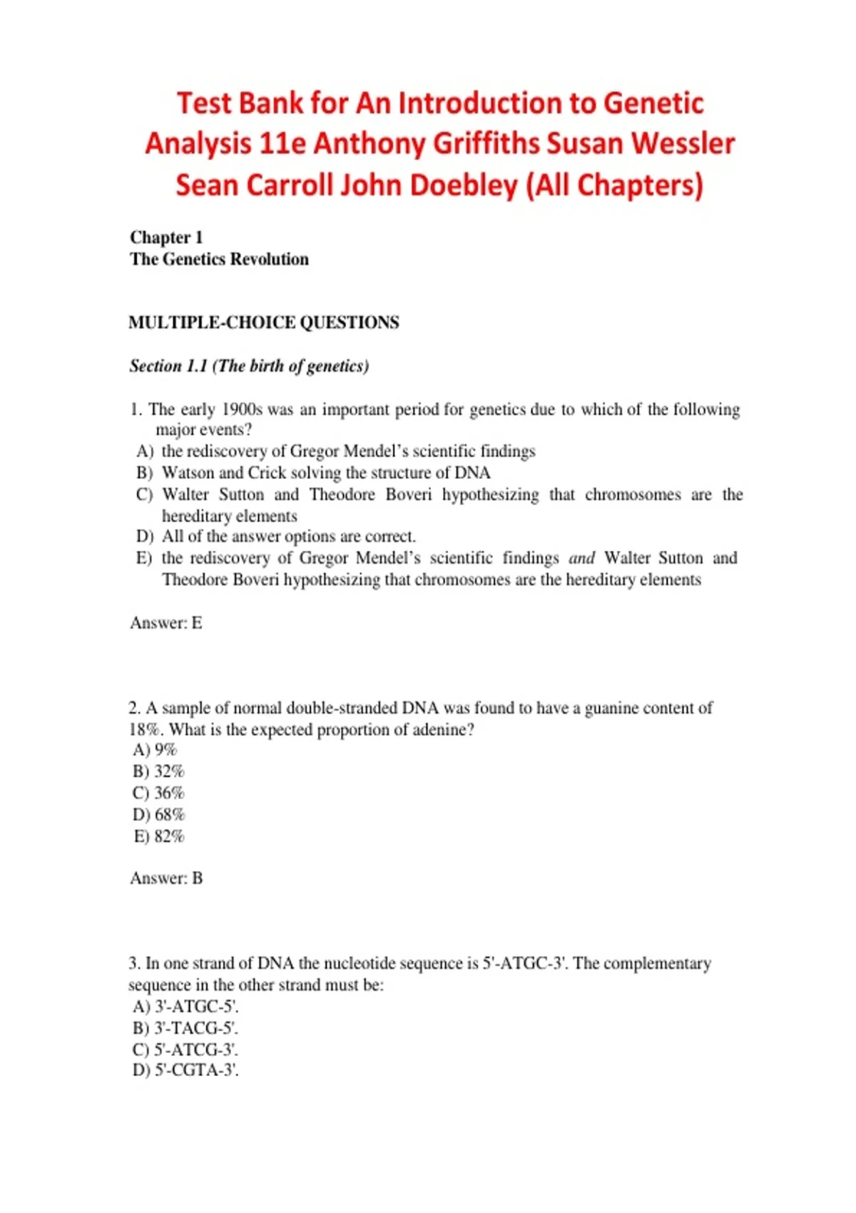 This Test Bank for An Introduction to Genetic Analysis, 11th Edition by Anthony J.F. Griffiths, Susan R. Wessler, Sean B. Carroll, and John Doebley is fully aligned with the Latest 2026 update and provides a comprehensive collection of exam-ready questions with verified correct answers. The test bank covers all major genetics concepts from the textbook, including Mendelian genetics, probability and inheritance patterns, chromosome structure and behavior, linkage and gene mapping, mutation, DNA replication and repair, transcription and translation, gene regulation, genomics, developmental genetics, population genetics, and modern genetic analysis techniques. Designed for midterms, finals, quizzes, and practice exams, this resource supports courses in genetics, molecular biology, biology, biotechnology, and life sciences. It is suitable for both students preparing for exams and instructors developing reliable assessments.