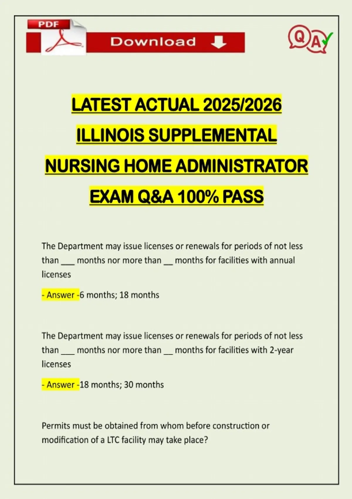 LATEST ACTUAL 2025/2026 ILLINOIS SUPPLEMENTAL NURSING HOME ADMINISTRATOR EXAM Q&A 100% PASS The Department may issue licenses or renewals for periods of not less than ___ months nor more than __ months for facilities with annual licenses - Answer -6 months; 18 months The Department may issue licenses or renewals for periods of not less than ___ months nor more than __ months for facilities with 2-year licenses - Answer -18 months; 30 months Permits must be obtained from whom before construction or modification of a LTC facility may