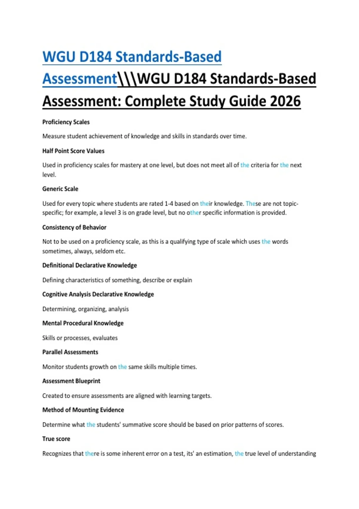 Master WGU D184 with this complete 2026 study guide for Standards-Based Assessment. Covers key frameworks, learning standards, assessment design, scoring, and exam-ready strategies.