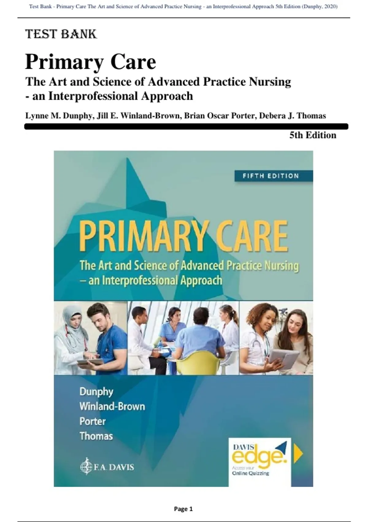 Test Bank for Primary Care The Art and Science of Advanced Practice Nursing An Interprofessional Approach 5th Edition by Lynne M. Dunphy,Jill E. Winland-Brown,Brian Oscar Porter,Debera J. Thomas This is not a book, but a test bank is a collection of pre-prepared exam questions and answers, designed to help teachers assess students' knowledge and understanding of course material.