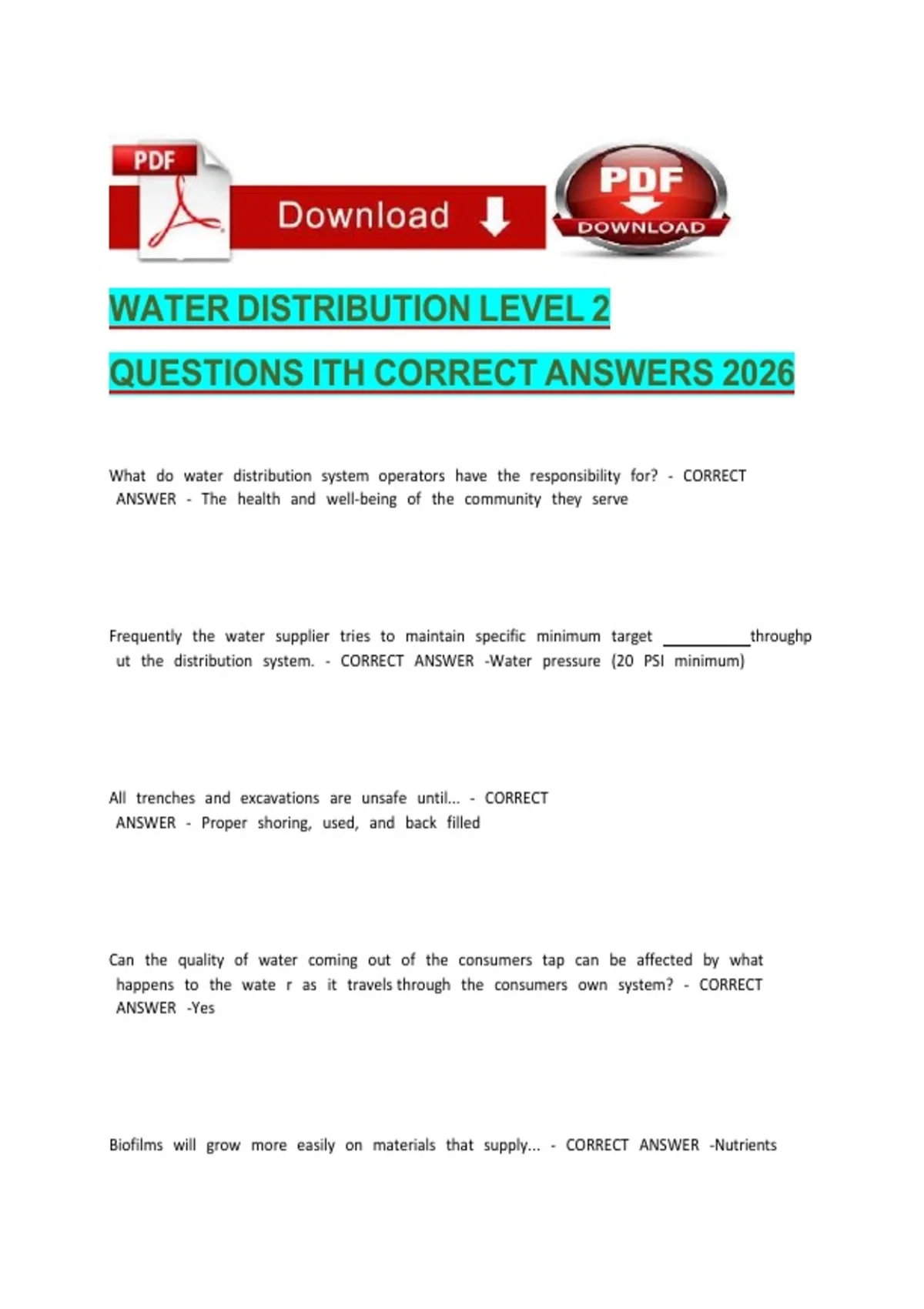 WATER DISTRIBUTION LEVEL 2 QUESTIONS ITH CORRECT ANSWERS 2026