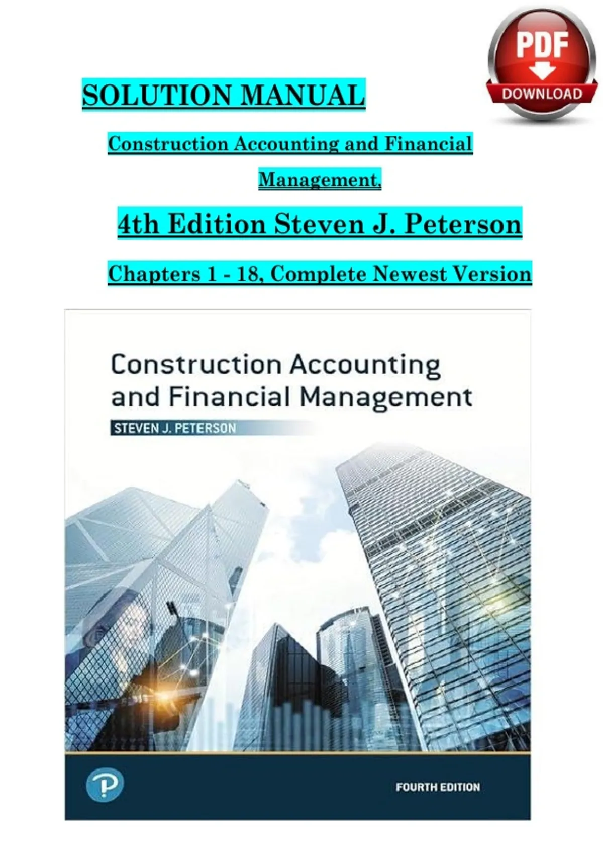 This is a solution manual for Construction Accounting and Financial Management, 4th Edition by Steven J. Peterson. It provides detailed answers for all problems from Chapters 1 through 18 of the textbook. The manual gives clear, step-by-step solutions, allowing you to fully understand key concepts in construction accounting and financial management. Whether you're preparing for exams, working through assignments, or reviewing course material, this solution manual will save you time and provide you with accurate, well-explained answers to complex problems. This resource is ideal for anyone studying construction finance, project accounting, or cost control. It closely follows the structure of the textbook, so you can easily match solutions to chapters and questions. With this manual, you’ll be able to approach your coursework and exams with confidence. The manual covers a wide range of financial topics, including cost estimation, project budgeting, accounting for construction costs, and more. It’s the perfect tool to reinforce your learning and improve your grades.