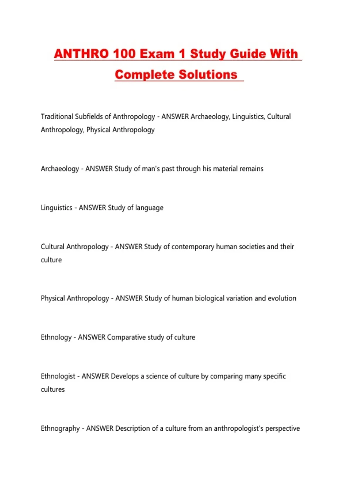 ANTHRO 100 Exam 1 Study Guide With Complete Solutions ...
