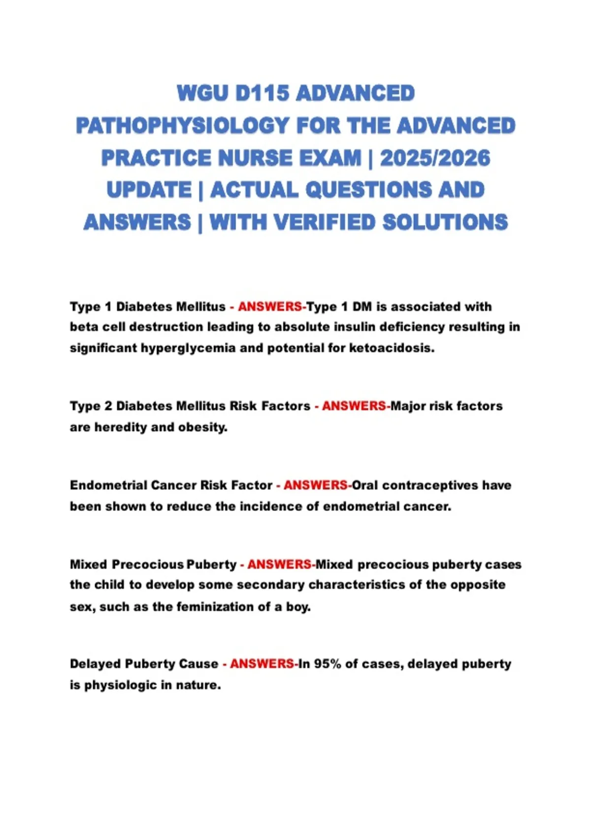 WGU D115 ADVANCED PATHOPHYSIOLOGY FOR THE ADVANCED PRACTICE NURSE EXAM | 2025/2026 UPDATE | ACTUAL QUESTIONS AND ANSWERS | WITH VERIFIED SOLUTIONS