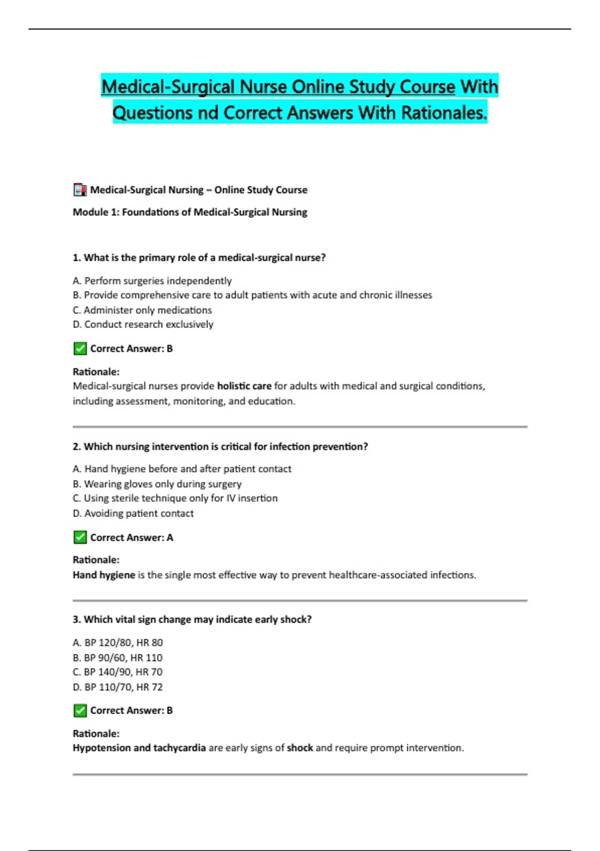 Medical-Surgical Nurse Online Study Course With Questions nd Correct Answers With Rationales.