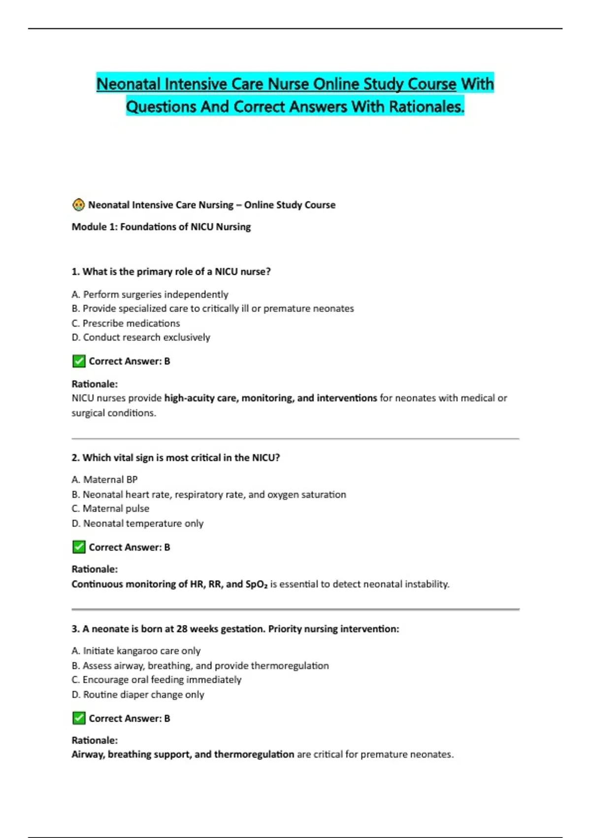 Neonatal Intensive Care Nurse Online Study Course With Questions And Correct Answers With Rationales.