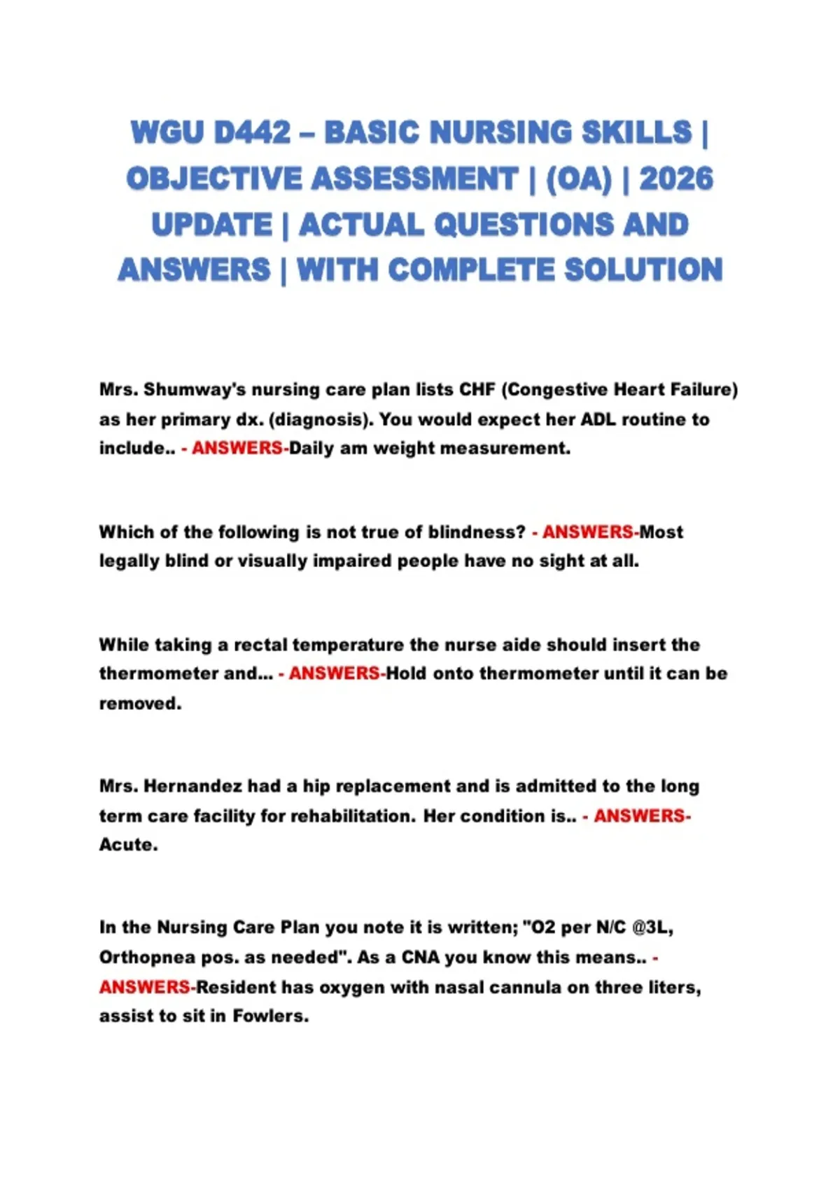 WGU D442 – BASIC NURSING SKILLS | OBJECTIVE ASSESSMENT | (OA) | 2026 UPDATE | ACTUAL QUESTIONS AND ANSWERS | WITH COMPLETE SOLUTION