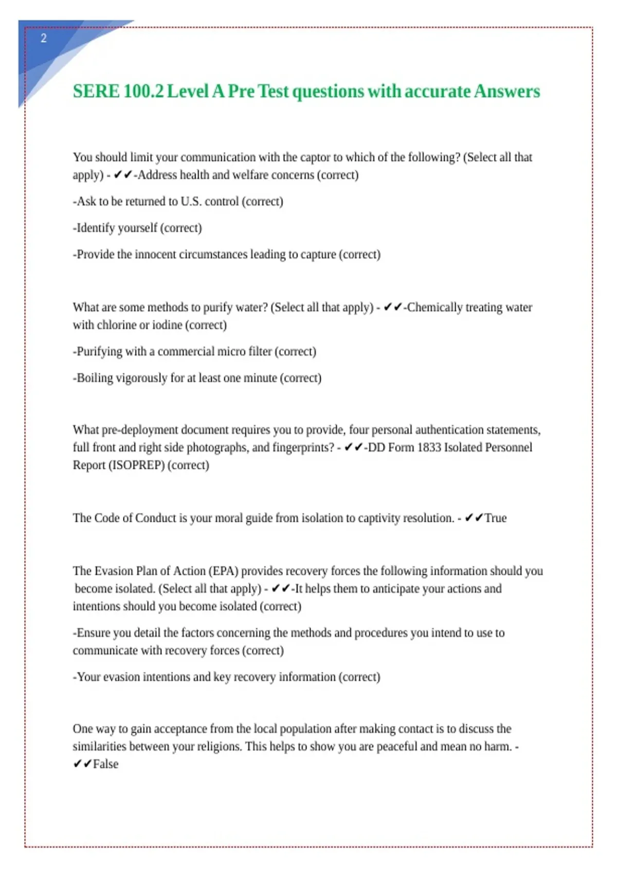 SERE 100.2 Level A Pre Test questions with accurate Answers || || || || || || || || ||