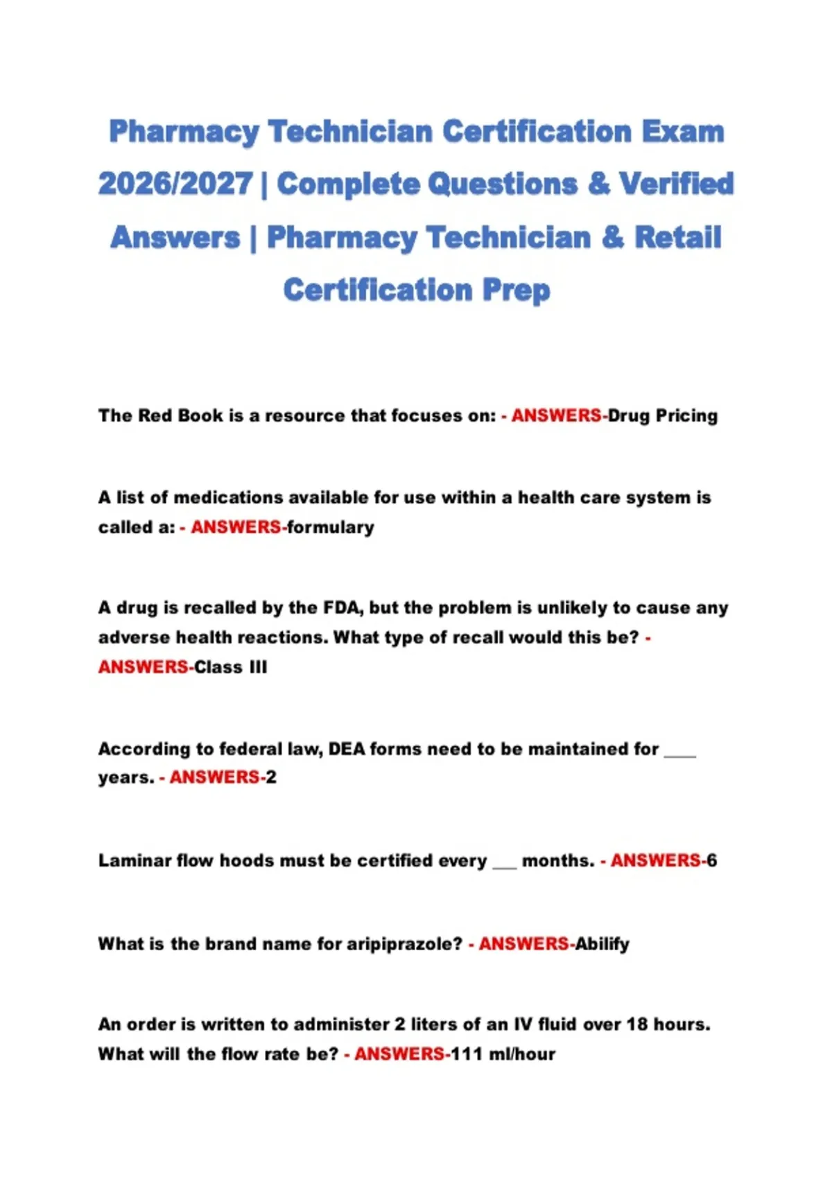 Pharmacy Technician Certification Exam 2026/2027 | Complete Questions & Verified Answers | Pharmacy Technician & Retail Certification Prep